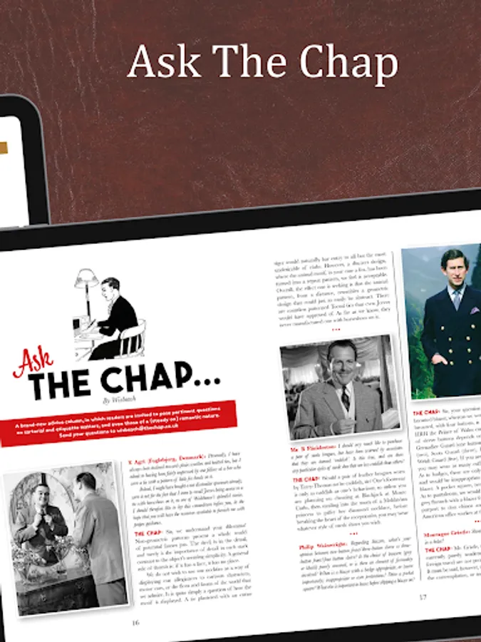 Readers are invited to send their photos in for a sartorial assessment and these are reproduced in the “Am I Chap?” section. Elsewhere, one may read interviews with notable living Chaps such as Chris Eubank, Sir Roger Moore, Adam Ant and Donald Sinden.
