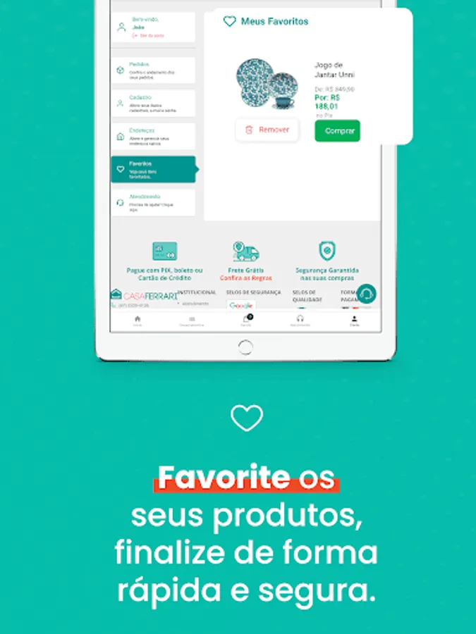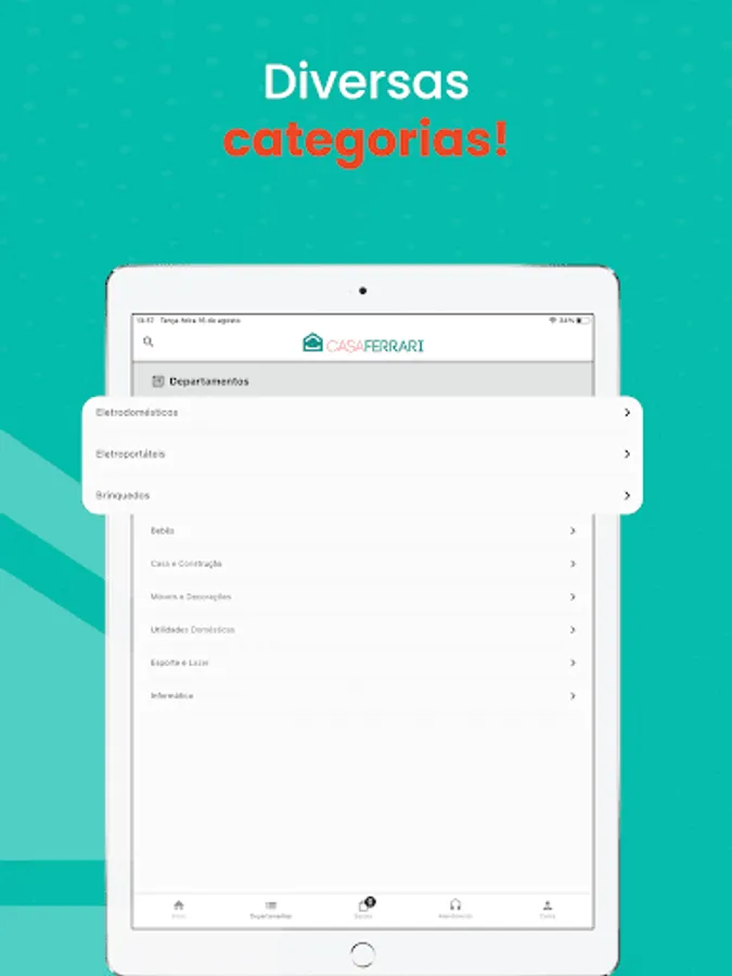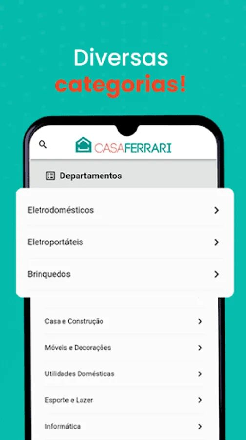 The Casa Ferrari App is an innovative platform developed to meet the needs of Casa Ferrari online store customers. Since 2014, Casa Ferrari has stood out in the market, offering a wide range of products in different niches, such as home appliances, small appliances, toys, babies, home and construction, furniture and decorations, housewares, sports and leisure and IT.