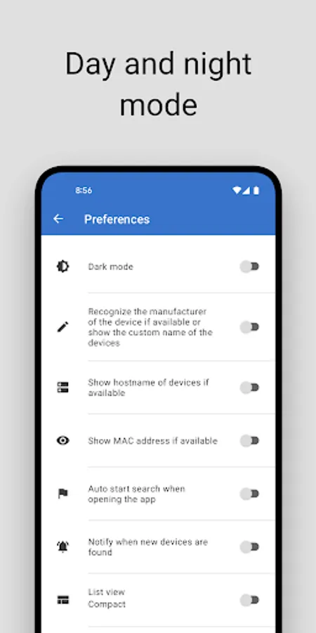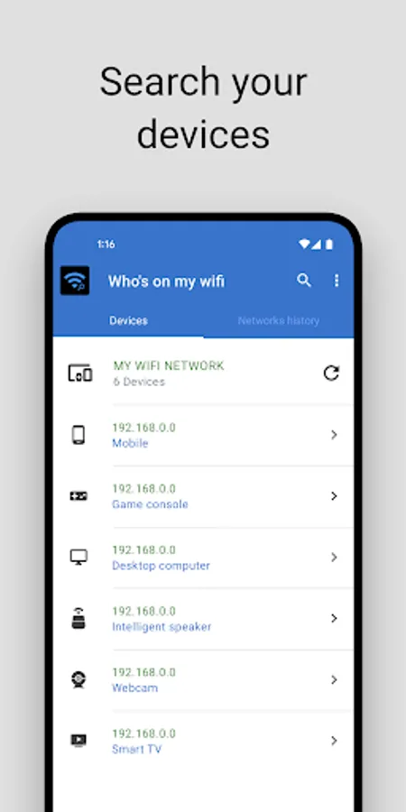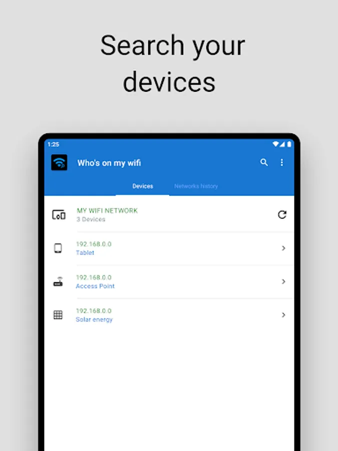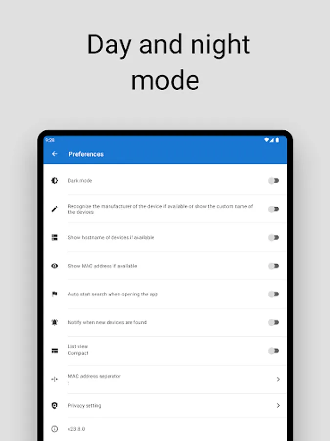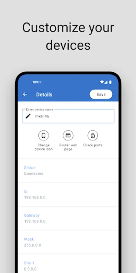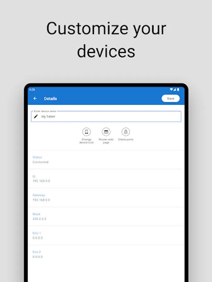 * Displays device information such as hostname, ip address, gateway, netmask, dns.