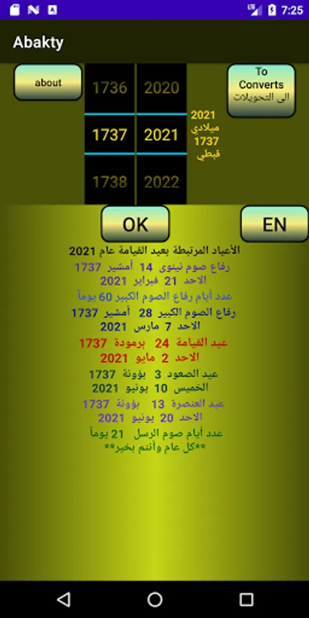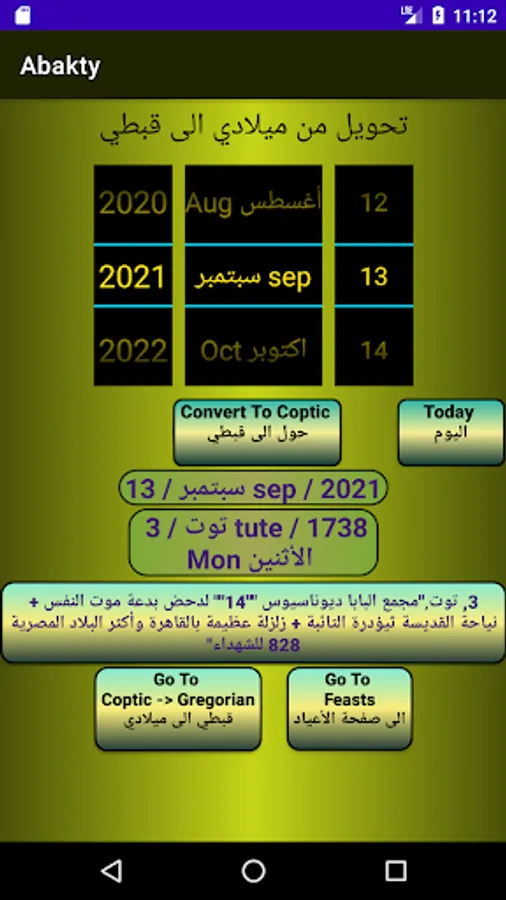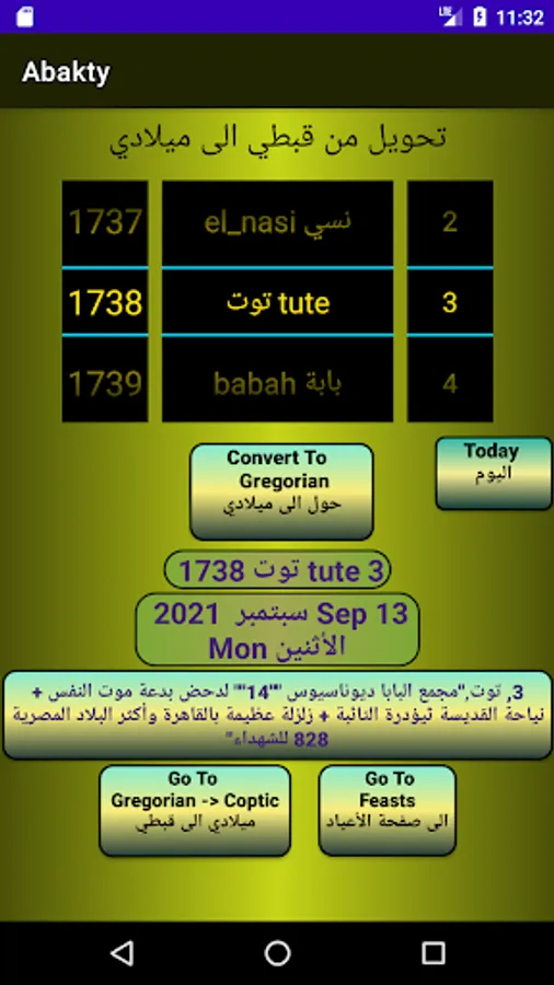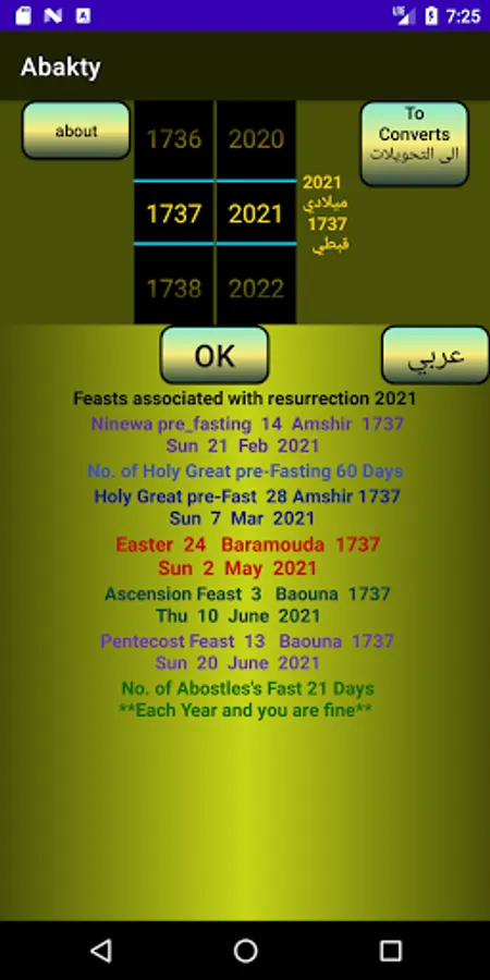This application (Abakty) has been designed to provide you with Easter date at any given Coptic as Gregorian year, in addition to all variable feasts associated with the resurrection celebration and more.