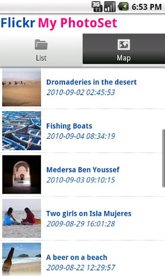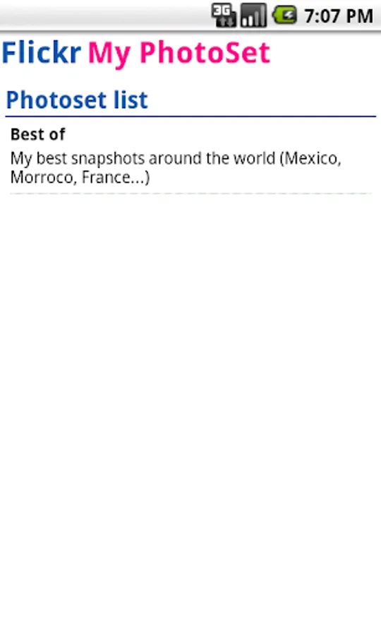With My Photoset, you can bring easily with you, your favorite Flickr photosets. Just enter a photoset ID and you can browse photos on a list or on a map. You can get as well details and comments about photos. All pictures are saved on your SDCard.