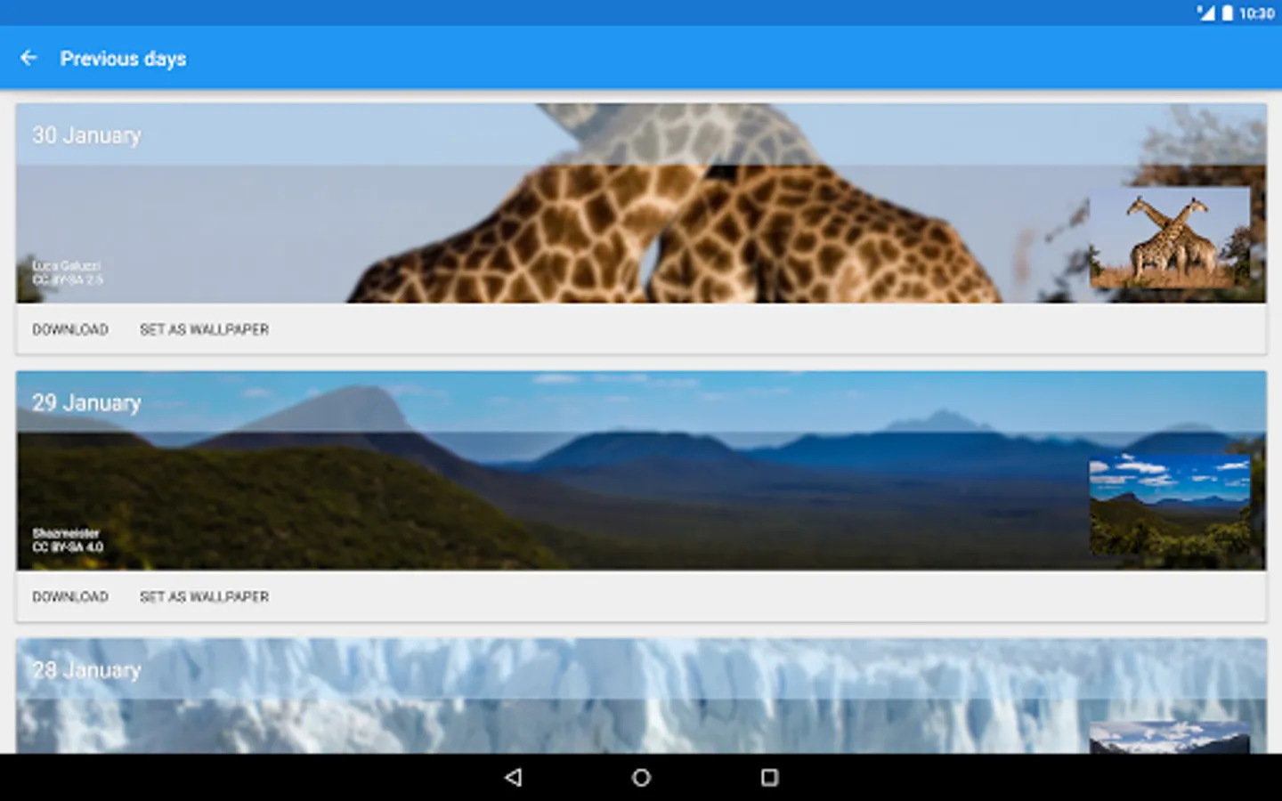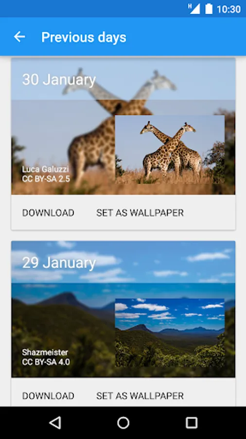 Everyday at 10:30 AM, a new wallpaper selected by us land on your device (phone or tablet). All wallpapers come from differents sources, unsplash, flickr, 500px, wikimedia, etc, and are royalty free.