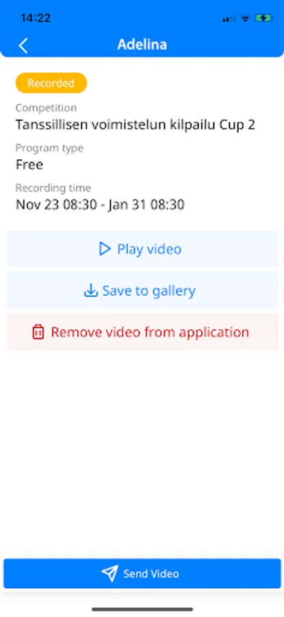 Vikis is a client application for participants of virtual sport competitions, competitions where participants take videos of their performances and upload them to be reviewed by judges and streamed to general public. Competition organizers grant recording/upload rights by providing registration codes to participants. Application limits the number of attempts and the time when the video can be taken.