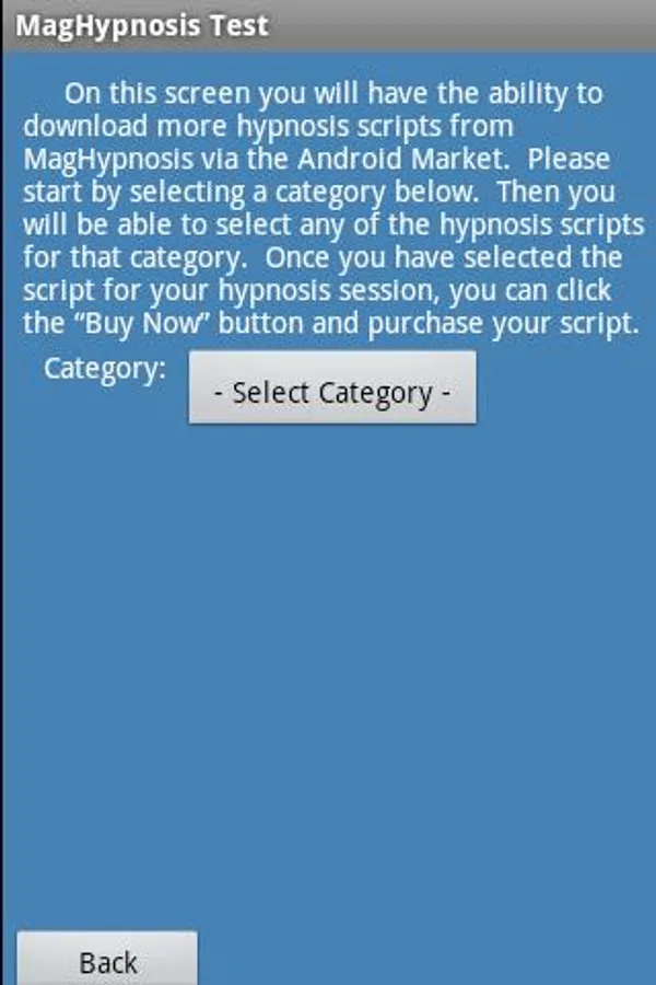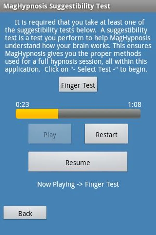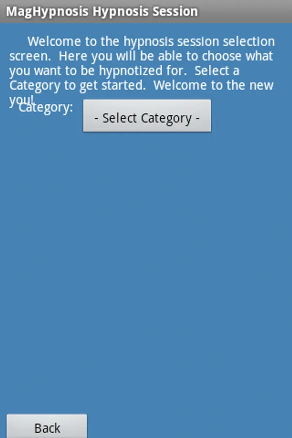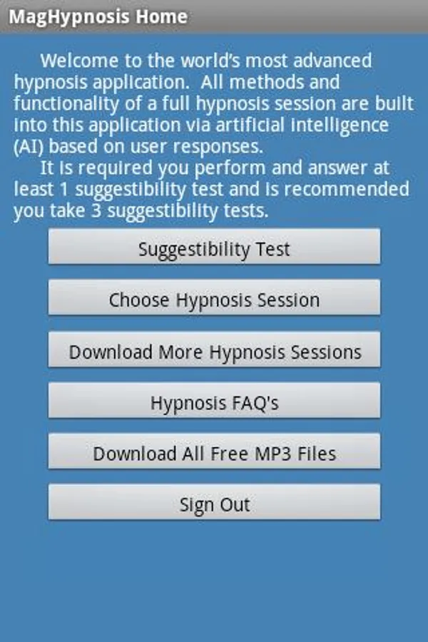 A. The application requires that you take at least one "Suggestibility Test" and recommends you perform three tests. Once this is done, click on the "Choose Hypnosis Session" button and select a Category and Script. Now click the Play button.