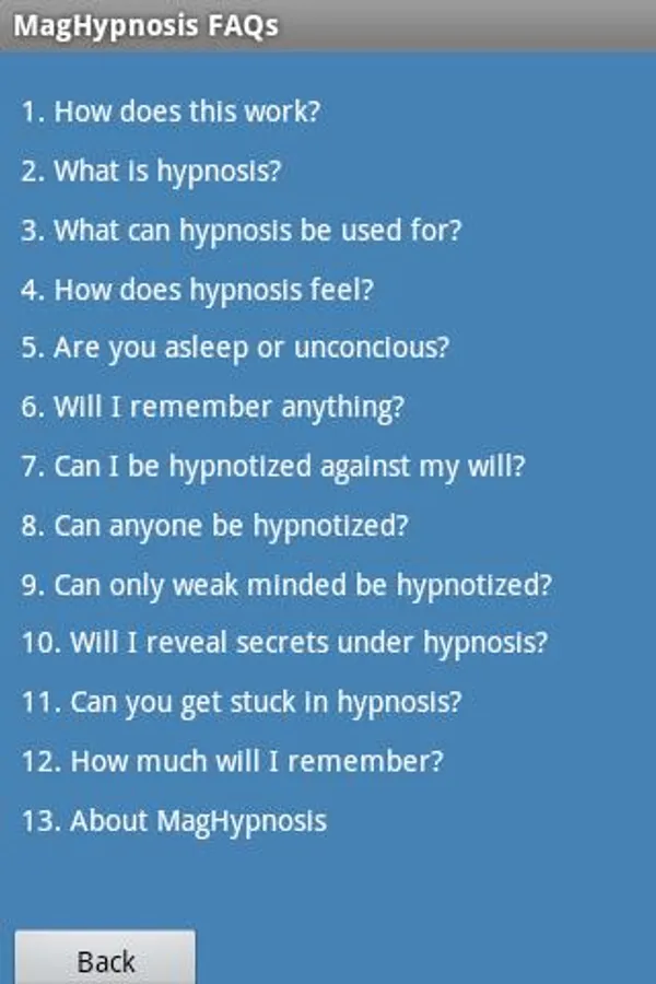 A. Short answer is No. There is a "Hypnosis FAQ's" button in the app that give you a bunch of answers to questions concerning hypnosis.