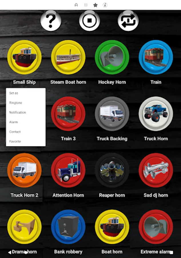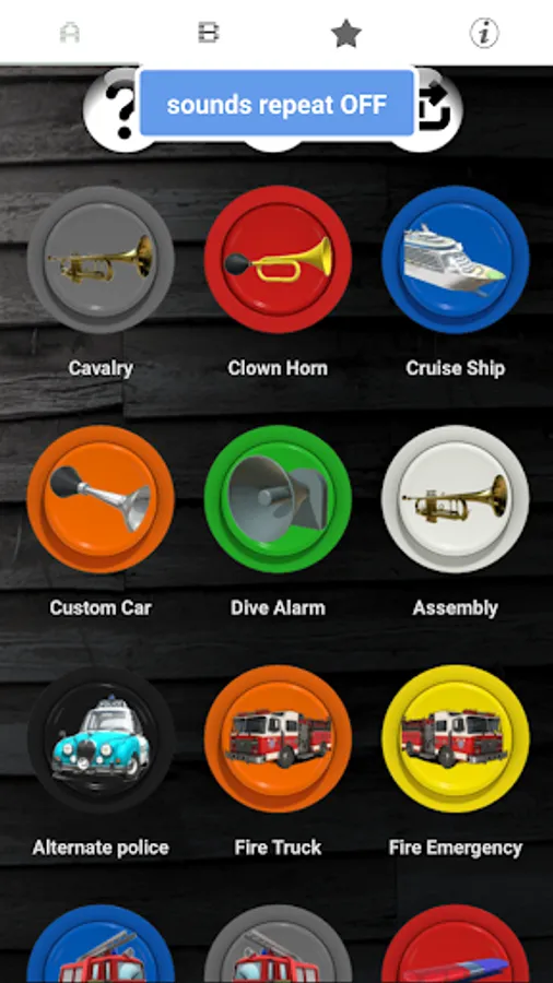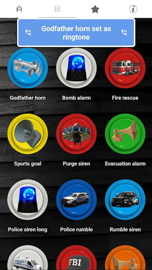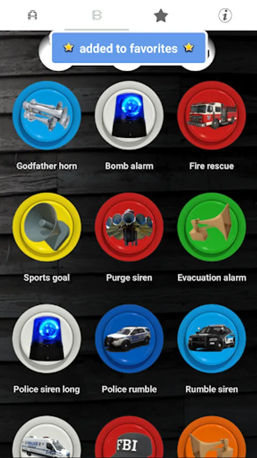 Horns and sirens features a collection of loud high quality real siren and horn sound effects in a sound board format. You can customize horns and sirens by saving your favorites to a custom board so you will always have loud sounds at the tap of a button. You can also save your favorite as a ringtone, notification sound, alarm sound or to a specific person calling.