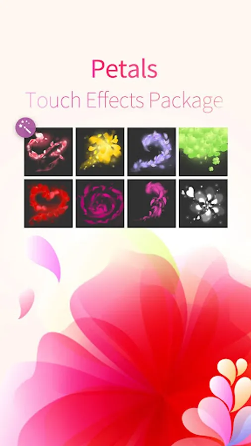Featuring with a collection of beautiful, colorful and sparkly floating flower petals, this touch effects package will help you make more incredibly beautiful wallpaper backgrounds to personalize your phone screen with colorful flower petals floating across it. And with more than seven kinds of gorgeous floating flower petals to choose from, you are sure to be able create uniquely beautiful live wallpapers on your own with this gorgeous flower petals package and Magic Finger- Live Wallpaper DIY Maker.