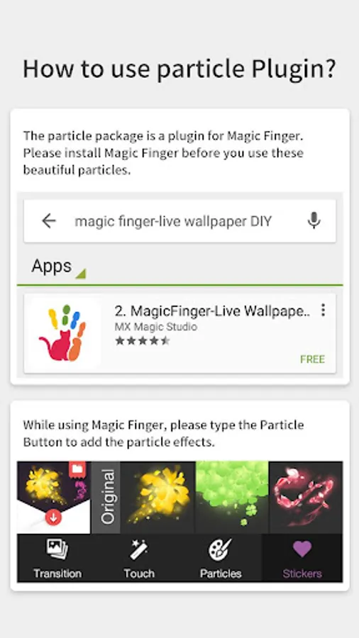 This fabulous touch effects package featuring beautiful flower petals of vivid colors is a plugin that only works inside Magic Finger-the Most Popular Live Wallpaper DIY Maker (applying for versions above 1.0.1). You can download Magic Finger- Live Wallpaper DIY Maker for FREE here: