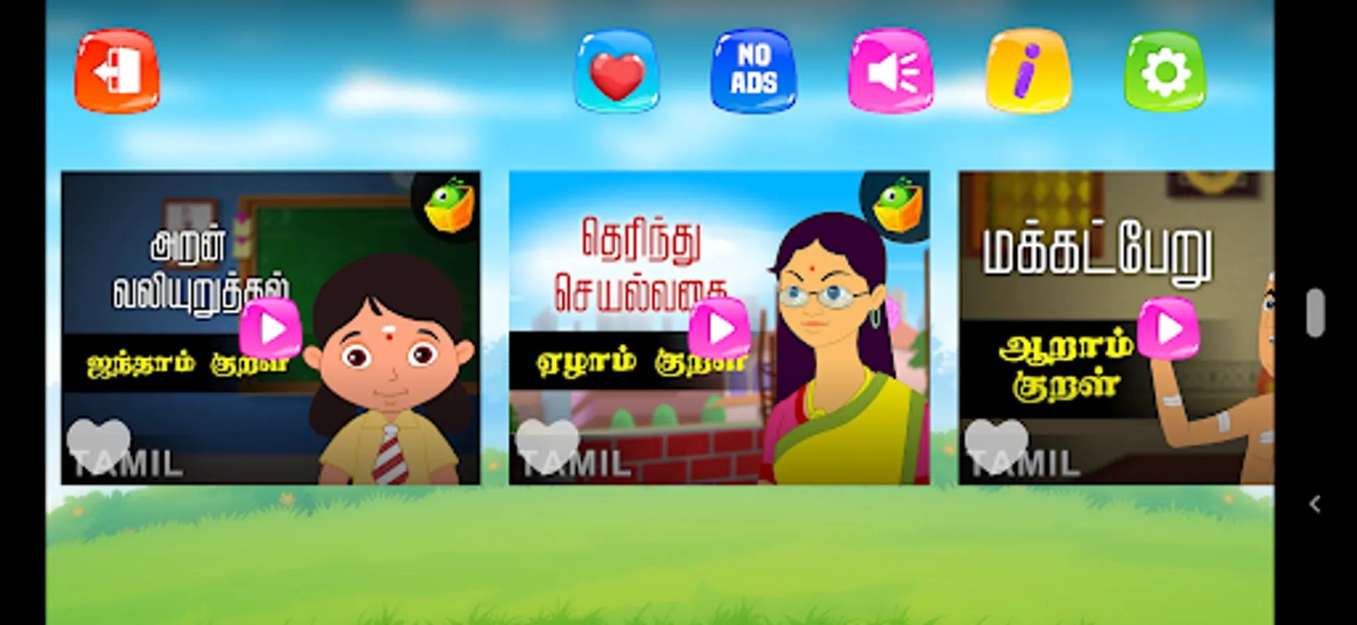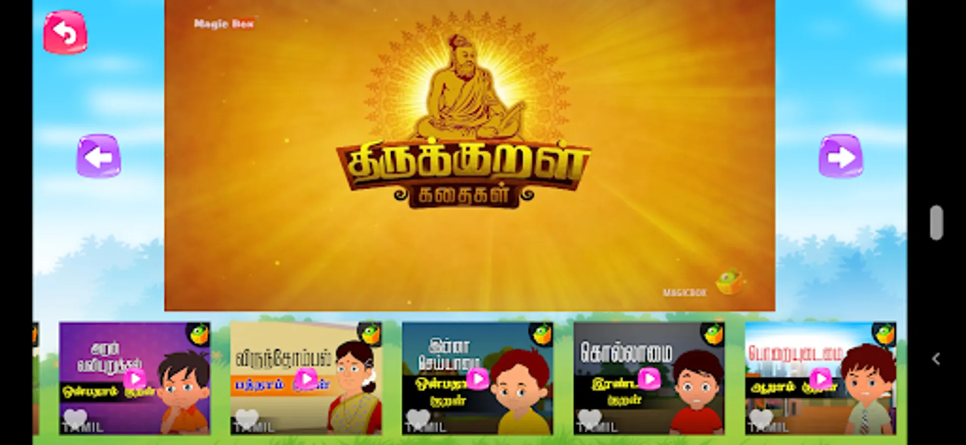 Thiruvalluvar a celebrated Tamil Poet in his lifetime, compiled the greatest compilation of couplets on the ethics, economics, politics and affection in a man's life. These stories presented by MagicBox Animation are clever tactics to teach children the basic principles in life and make the learning process a fun one at the same time. So sit back, relax and enjoy these 16 episodes of infotainment.