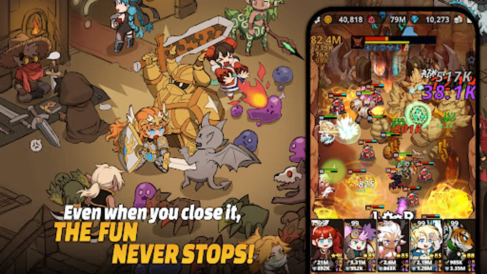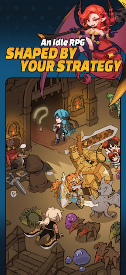 Collect the heroes you meet in the dungeon and work out the perfect synergy between them.