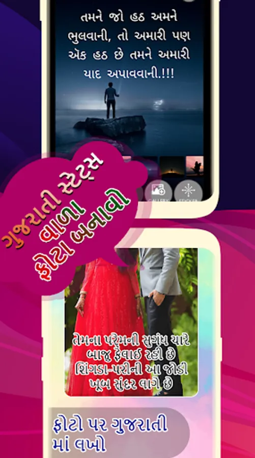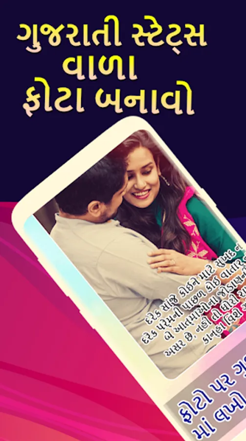 Phota Par Gujarati ma Lakho app allow you add romantic Gujarati text and gujarati poetry on your gallery photos or on given rich collection of HD and stylish Background.