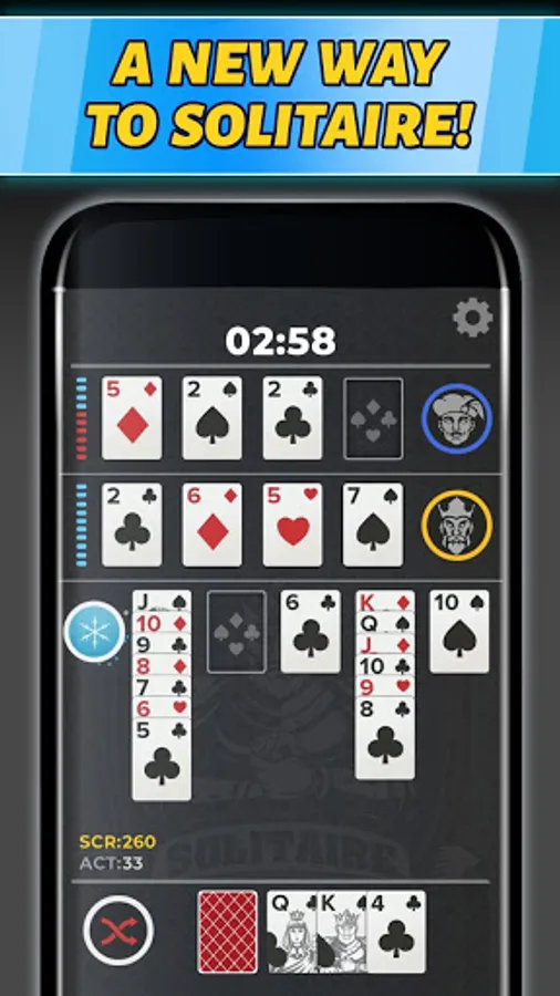 The goal of this solitaire card game is to earn as many points as possible in the given time. Gameplay is similar to classic solitaire, but in Solitaire Freeze War all players share their foundation piles and need to play fast to win. The time is limited – you have only 7 minutes for one play. You can play on any foundation pile. Clear your down cards. Freeze the game...with enough points to win!