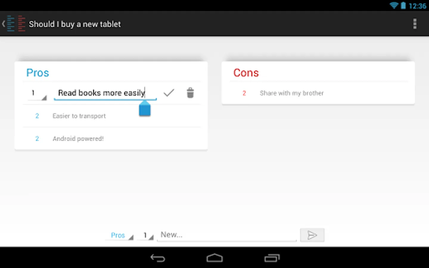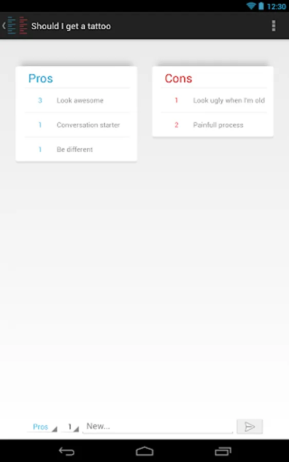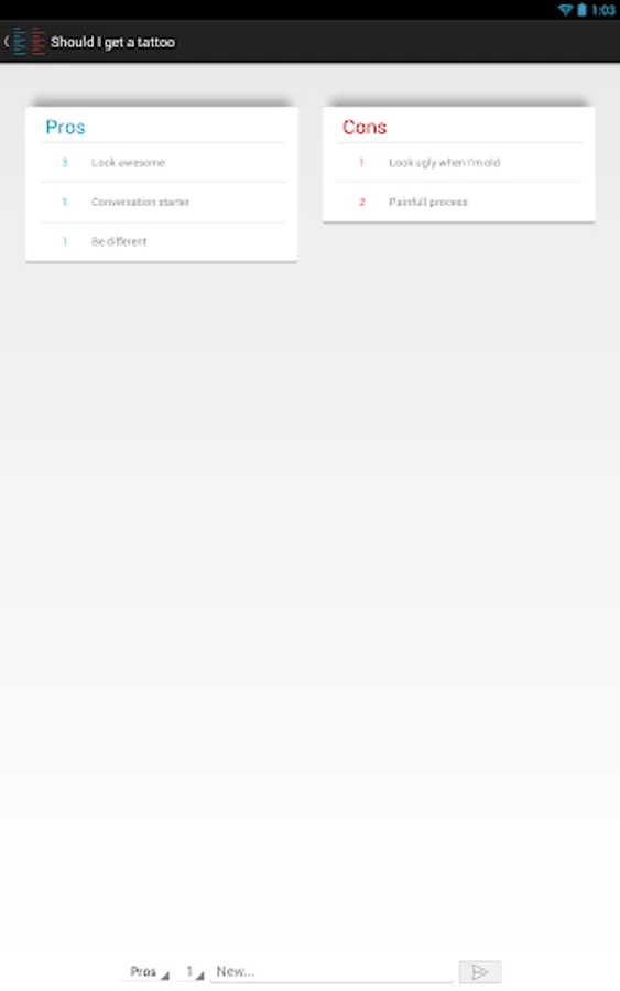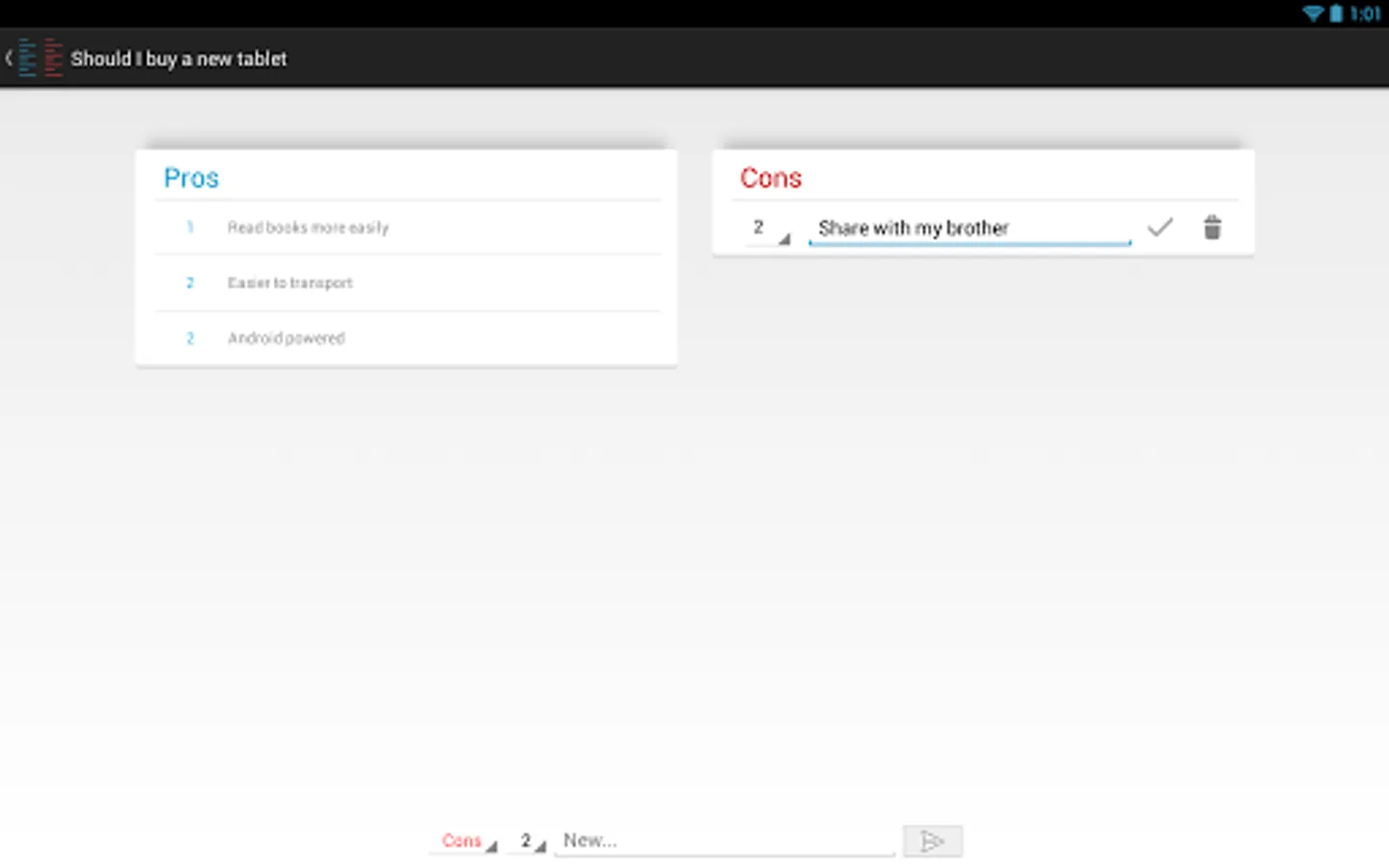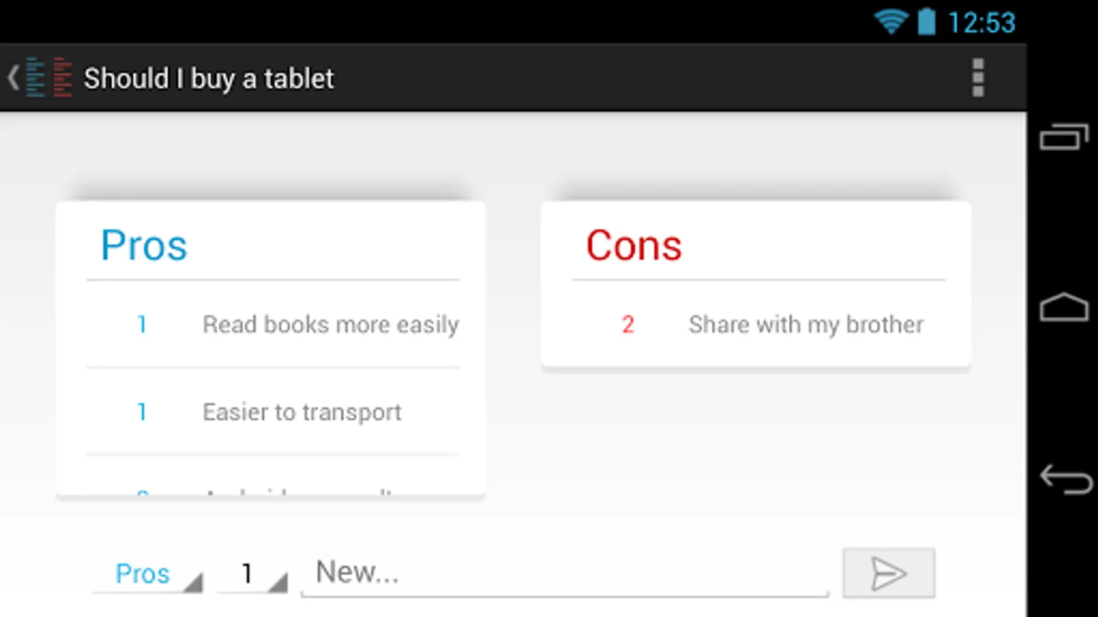 Pros and Cons is an app that will help you take decisions. I'm sure you've always wondered "Should I really do this?" or other question like this.