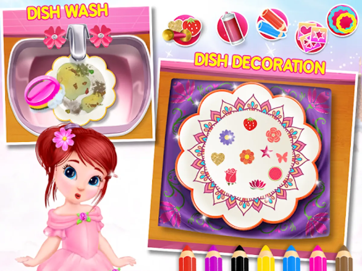 —> Dish Washing: Let’s clean and wash dirty dishes and decorate them by paint, stickers and glitter.