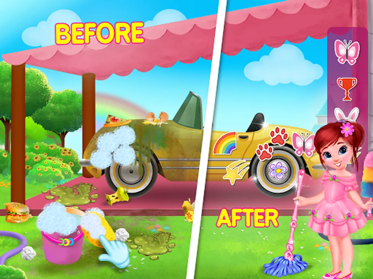 —> Garage/Car Washing: Let’s clean cute car by washing it and throwing trash to the dustbin and decorate it with cute stickers.