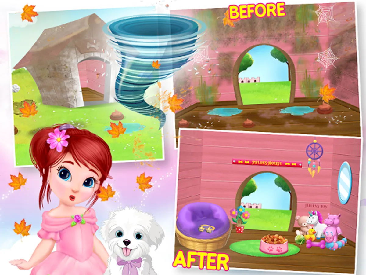 You can have fun cleaning up this princess room or castle or house with different activities like, straighten the lights, wall hangings, lamps, furniture, rearrange her dolls, soft toys, and other items, scrub the stains, sweep and mop the floors, wipe the wall stains, remove spider webs using duster, arrange dining table with fresh fruit bowl and dishes, vacuum the floor and throw away the junk and so much more! Renovate and decorate rooms in princess mansion! Take care of this dream home by cleaning and decorating it. Ever wanted to be a princess and live in a beautiful castle? Your dream comes true with My Princess Castle! The best princess game of all times is here! Build and renovate your dream castle!