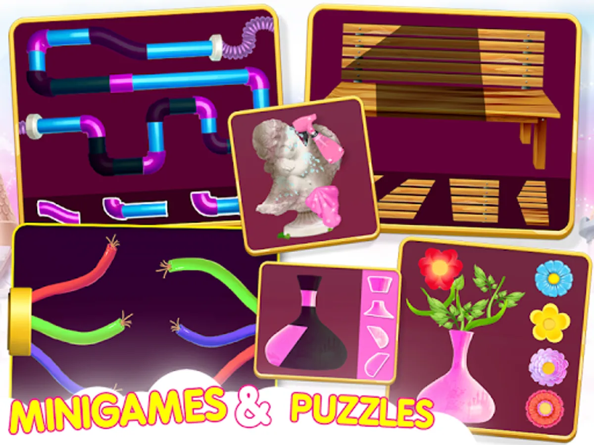 —> Garden Cleaning: The garden is dirty too! Let’s help this beautiful girl to clean up this big garden by throwing away all the garbage to the trash, fixing the bench, cleaning the cute statue, sweep the castle path, cutting the extra plants and shape them up, watering the plants so that flowers can bloom.