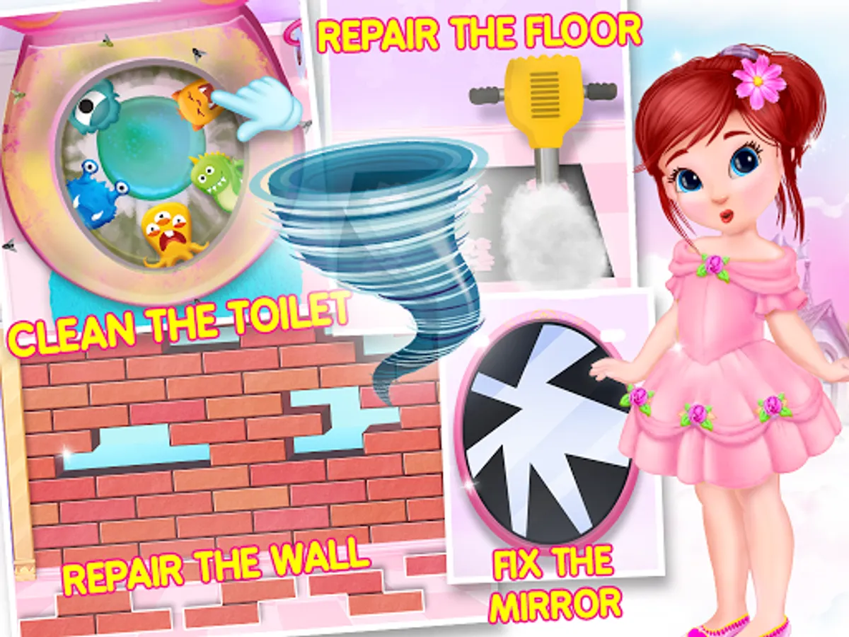 —> Bathroom Cleaning: Bathroom is do dirty and smelly! Help little princess to make it clean and tidy by throw the rubbish away in the trash, sweep the floor, scrub the stains, fix the broken things like wall, mirror, washbasin pipe, paint the wall, rearrange the bricks, clean the toilet from the germs, duster to remove cobwebs.