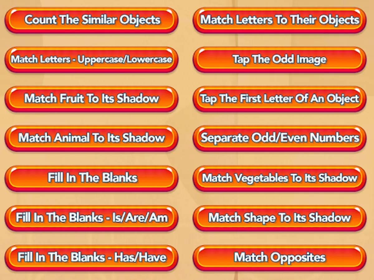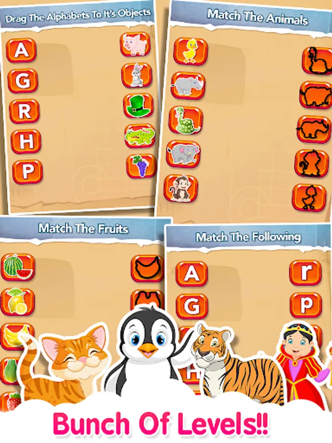 It has categories like, Match the - letters to its objects, Fruits with their shadows, vegetables with their shadows, Animals with their shadows, Shapes with their shadows for kids to learn basic identification of common objects which will boost their marking skills.