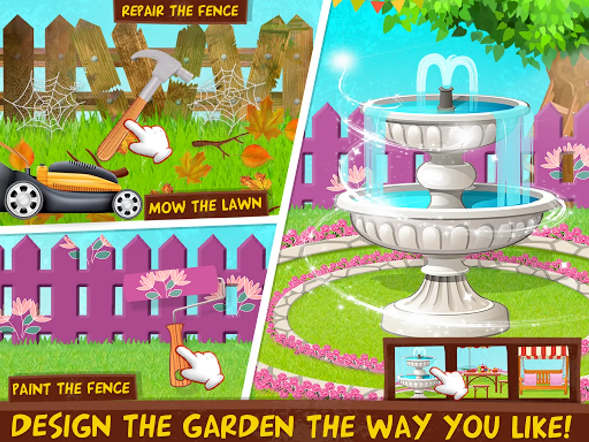 Second is Fixing and Repairing, Each room is packed with tons of real-life fixing activities. Fix kitchen cabinet doors, fix the fence in the garden, Fix the water pipe by solving jigsaw puzzle, Door fixing, Fill the fridge with fresh food, Add some groceries in kitchen cupboard, Arrange kitchen with all the kitchen essentials, Fill the freezer with ice creams and candies, Drill the wall in Bedroom, Like a real housemaster, you will have to fix it all using hammer and nails, a screwdriver and an electric drill.