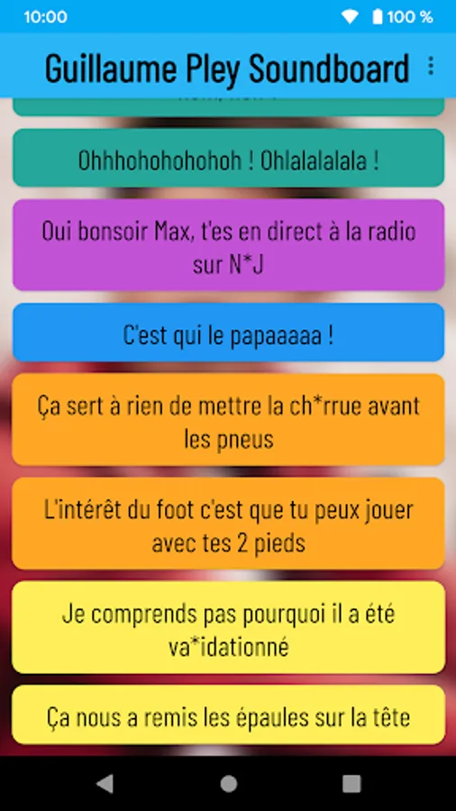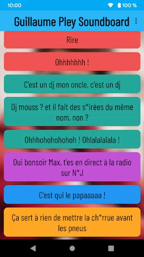 This application allows you to have fun playing the best cult phrases said by Guillaume Pley!