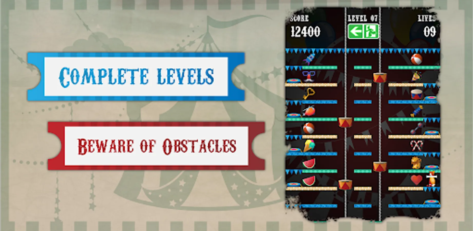 - Help the Clown overcome the Behind-the-Curtains obstacles and reach the Main Circus Tent.