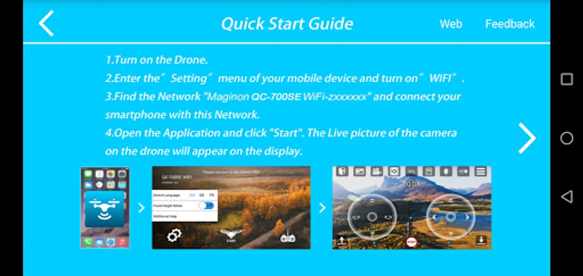 Application with full control, gearing and Live-Picture transmission from the Maginon QC-700 / QC-707 / QC-800 Quadrocopter. With this application you can controll all functions and you can start and stop photo and video recording. With a full access to the gallery on the memory card you can view all recorded pictures and video clips.