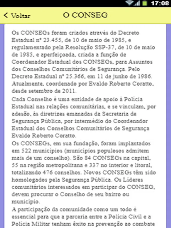 The CONSEG were created by State Decree No. 23455 of May 10, 1985 and regulated by Resolution SSP-37, of May 10, 1985, and perfected, created the State Coordinator of the CONSEG for Affairs Community Councils of security. By State Decree No. 25,366 on 11 June 1986. Currently, coordinated by Evaldo Roberto Coratto since September 2011.