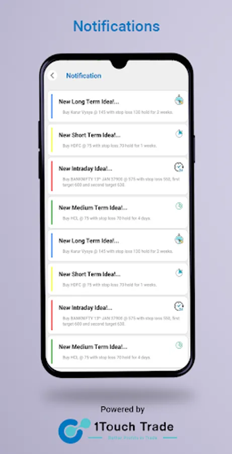 1Touch_Trade provides you free intraday learning and historical ideas. This app is only to watch market prices and learning swing/intraday Analysis.
