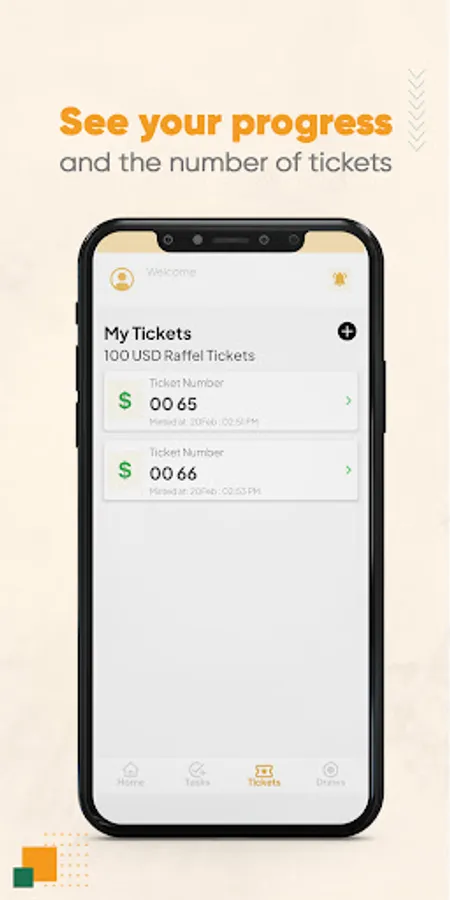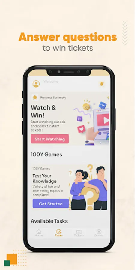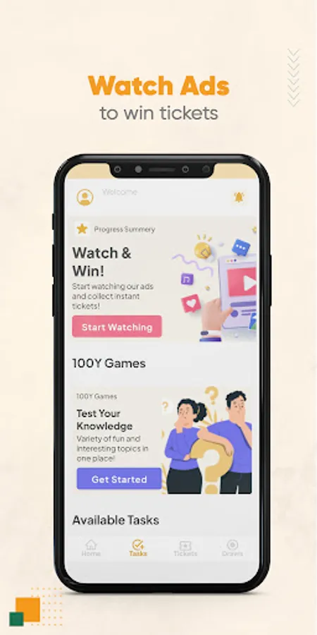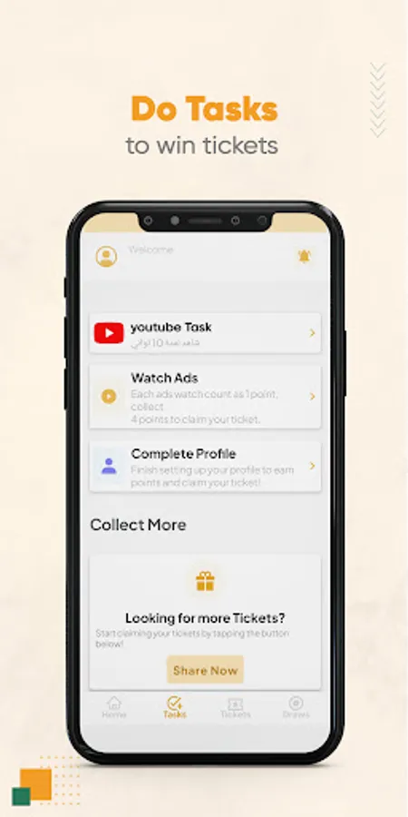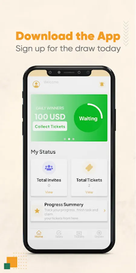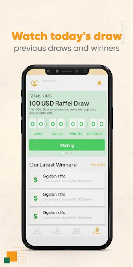 100 Yawmiyyi gives users tickets to join a daily draw of 100$. The draw lots will be done randomly and mechanically. To win a ticket, the user does one of the task types: watch advertising videos, answer a group of questions or do tasks via social media.