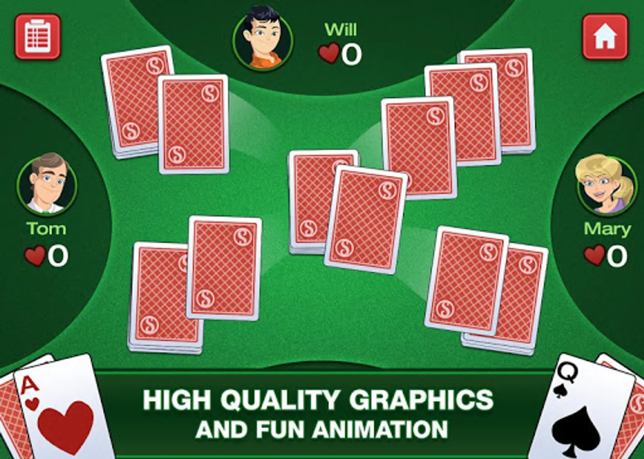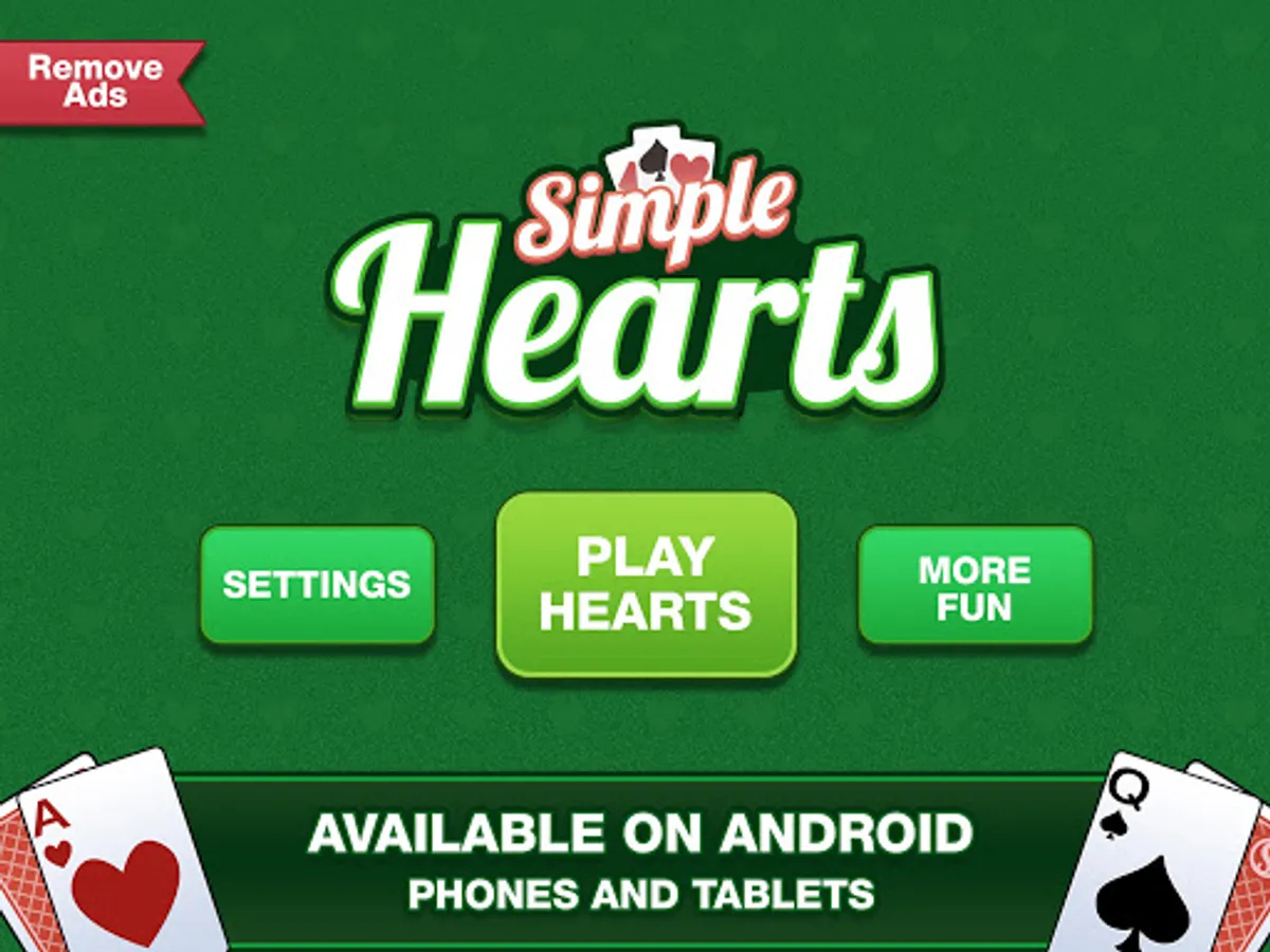 Play the best classic Hearts card game designed specifically for Android! Simply Hearts gives you the fun and relaxing Hearts experience you know and love. Play anywhere, with three intelligent computer opponents that feel so realistic it's like they’re sitting at the table with you. The popular card game, also known as Rickety Kate, Black Lady, Black Maria, Dame de Pique and Black Widow, is a family card game favorite. Download and play the best free Hearts game wherever you go.