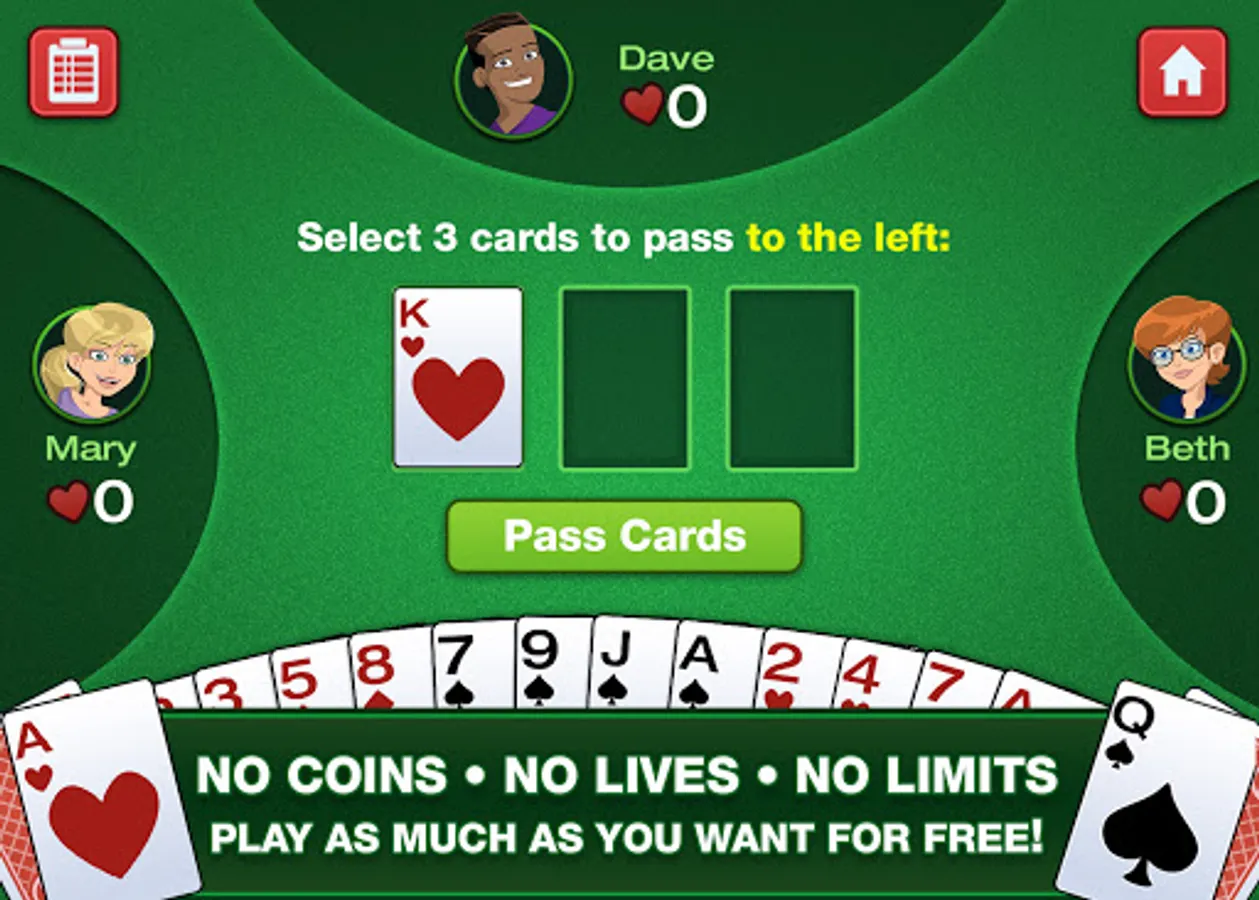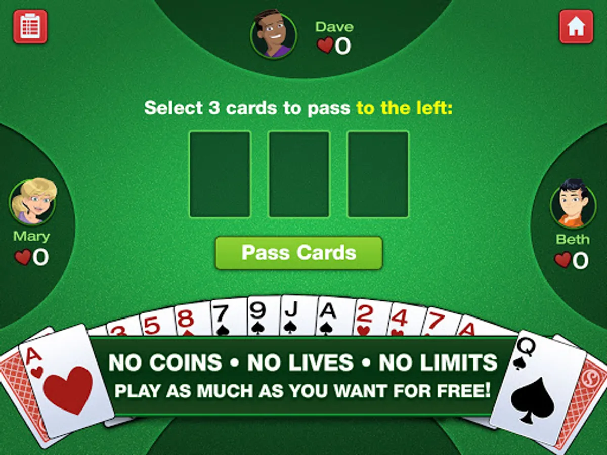 Simple Rickety Kate is played using a traditional 52 card deck with no formal teams or partnerships. Each player plays for themselves. The objective is to avoid winning tricks with any hearts in them, and to avoid winning the trick containing the Queen of Spades. In Rickety Kate you can toggle Shooting The Moon and, taking hearts gives you a much higher score.