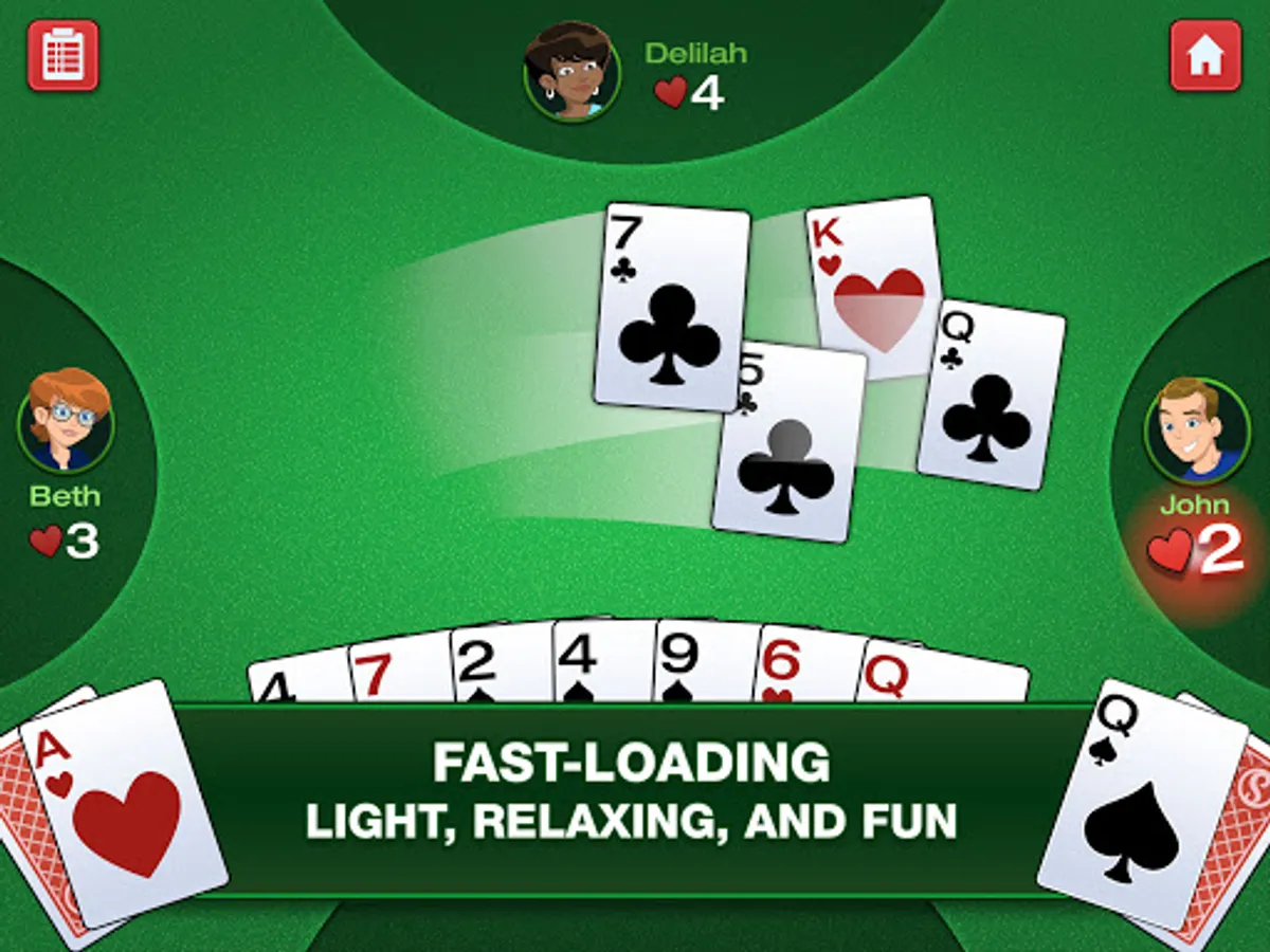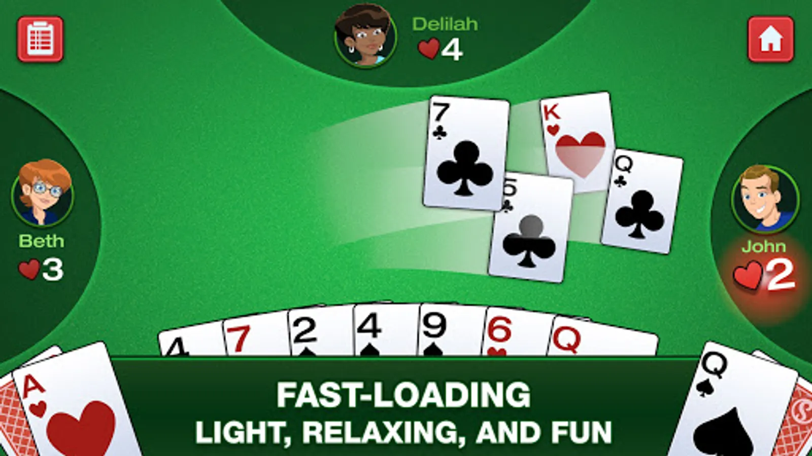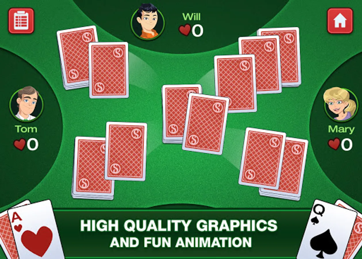 Simple Rickety Kate is your favorite trick-taking card game, now on your Android device. Challenge intelligent computer opponents to as many games as you like, without worrying about lives, timers, or other limitations. The popular card game, also known as Hearts, Black Lady, Black Maria, Dame de Pique and Black Widow, is a family card game favorite.