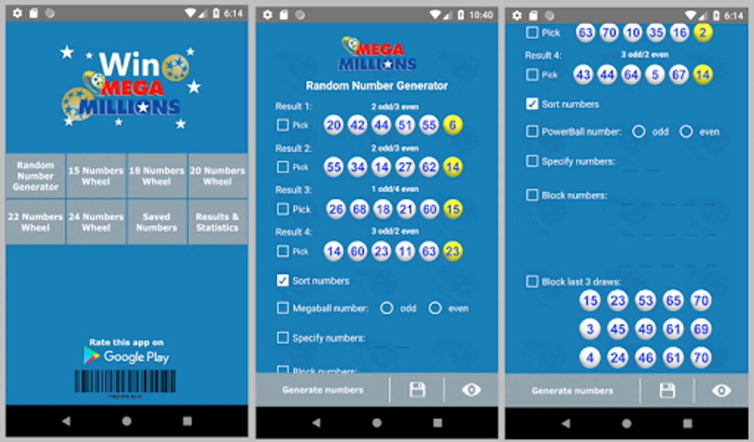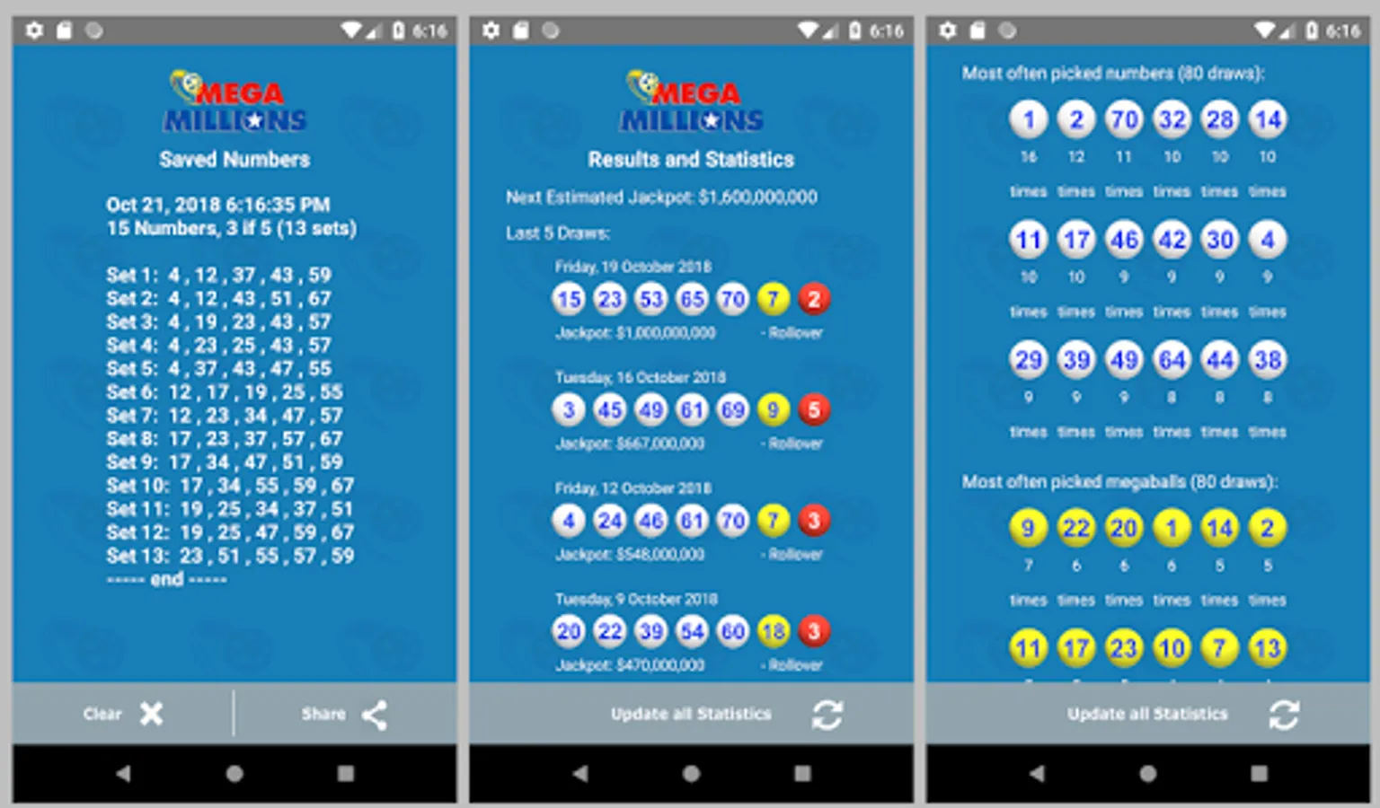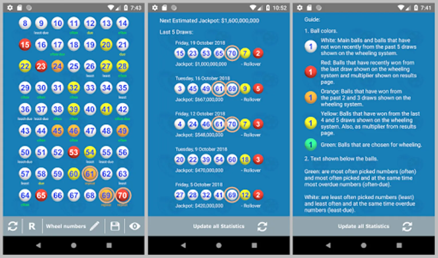 7. Simple statistics are summarized on one page of this app, i.e., the winning numbers from the last 5 draws, the most often picked main and megaball numbers, least often picked numbers, and most overdue numbers.