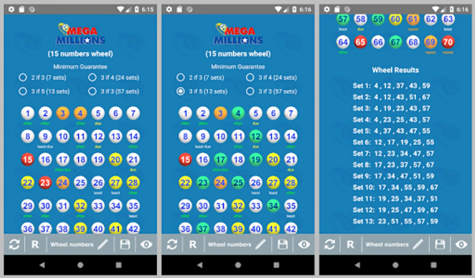 5. The following wheels are available, 15 numbers wheel, 18 numbers wheel, 20 numbers wheel, 22 numbers wheel, and 24 numbers wheel all with 4 guarantees to choose from. MegaMillions has a total of 75 main balls to play so the more balls to wheel the better your chances to winning prizes.