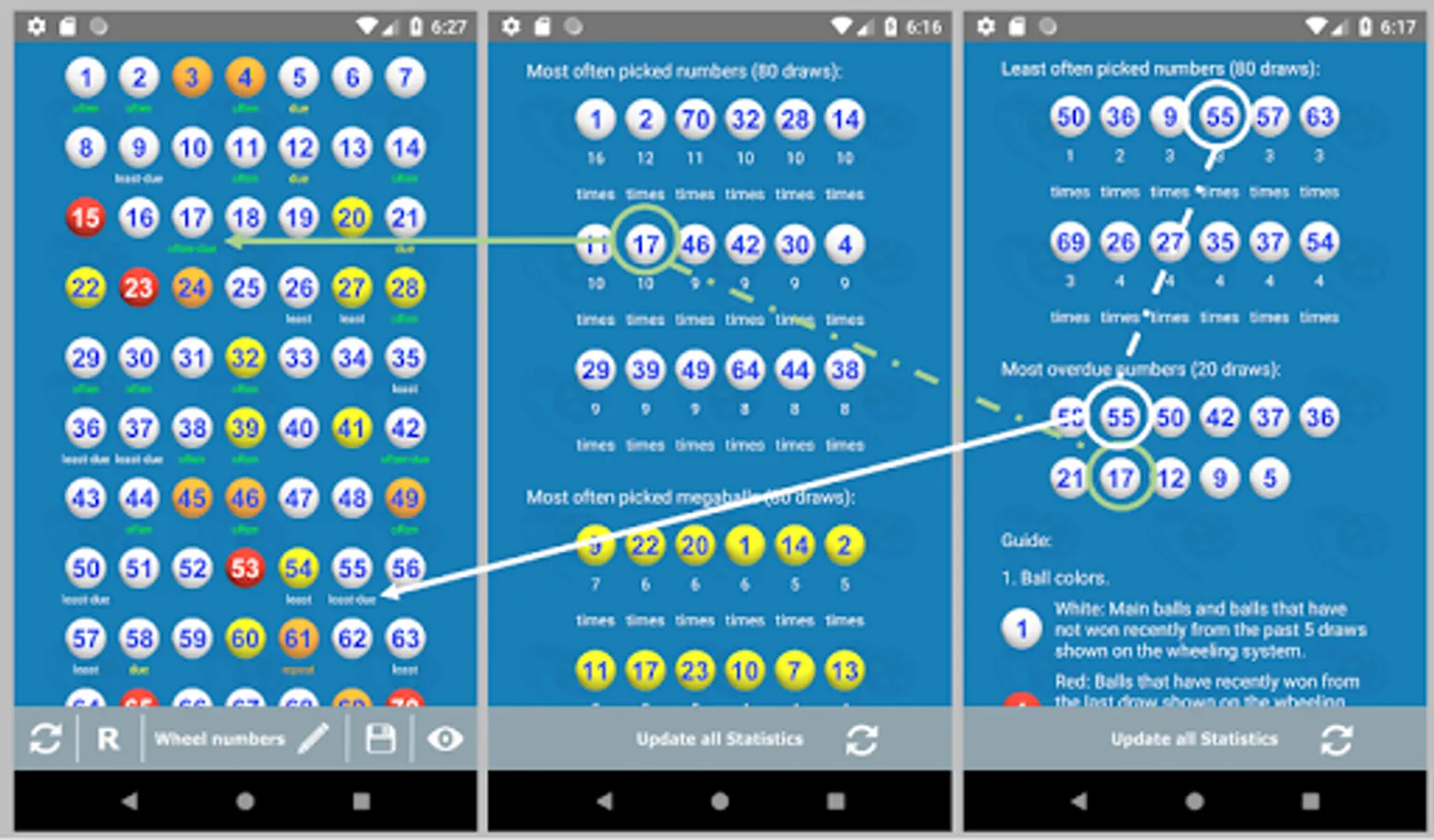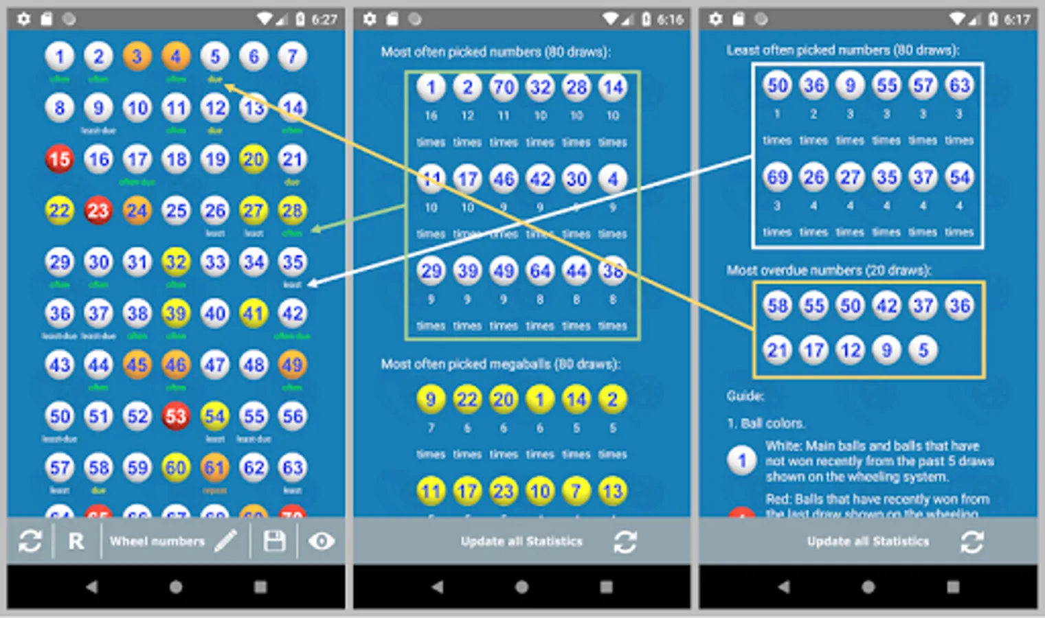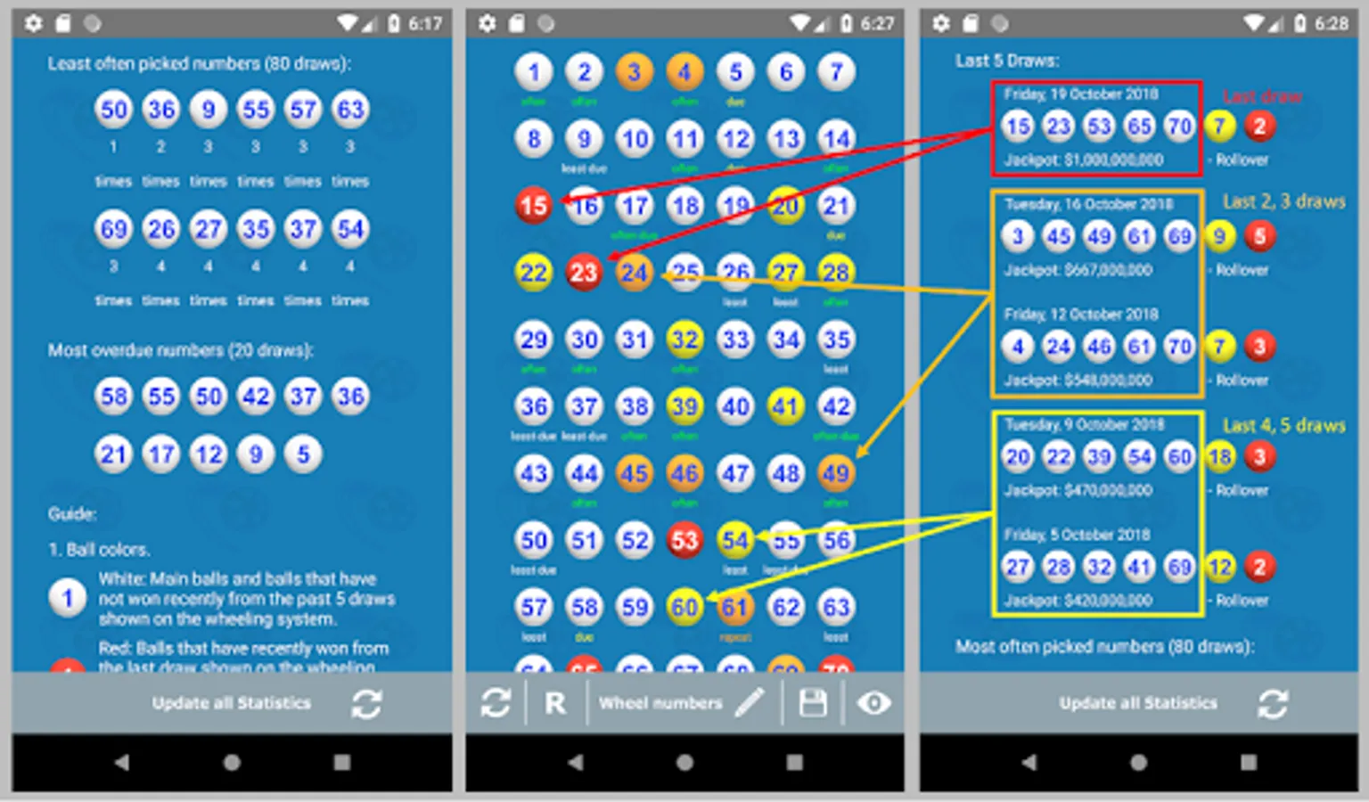 6. On the wheel page, this app marks the previously drawn numbers from the last 5 draws with different colors so the user can avoid including them in the wheel, well, also note that some previously winning numbers may repeat so it is advisable to check the trend. The marked balls are as follows - red (have won previously), orange (have won from the last 2-3 draws), and yellow (have won from the last 4-5 draws). In addition, most often picked (hot numbers), least often picked (cold numbers), and overdue numbers are also marked for your reference so you can plan your strategy to win the next draw.
