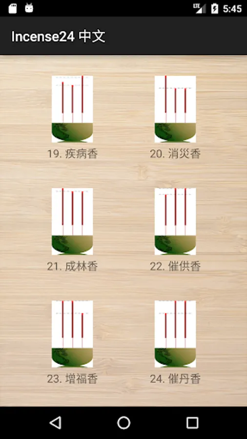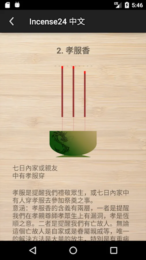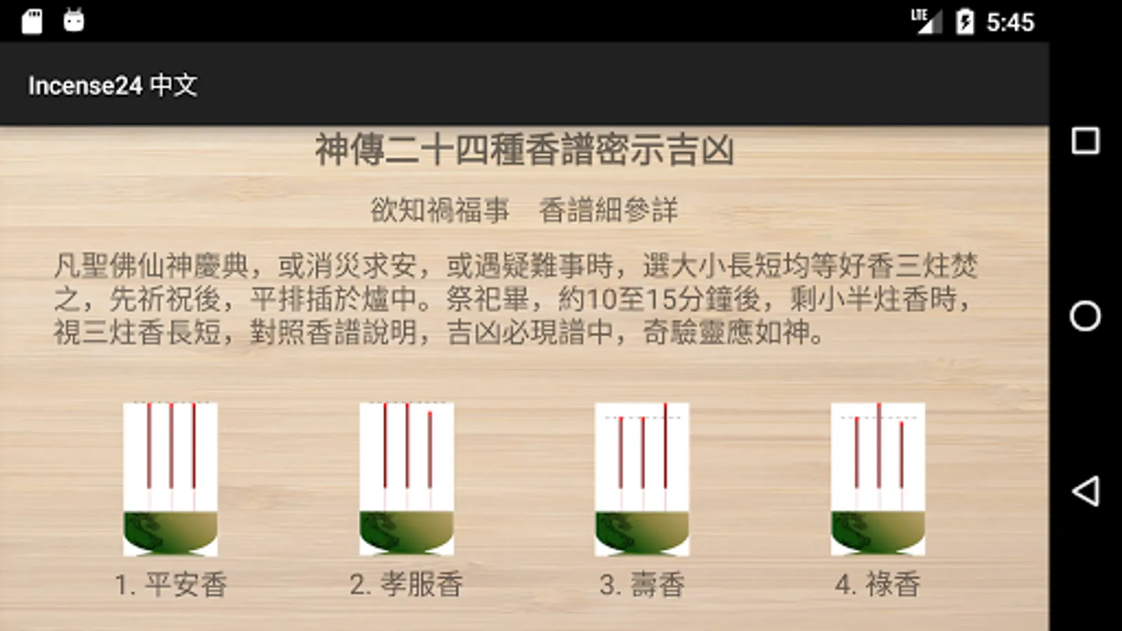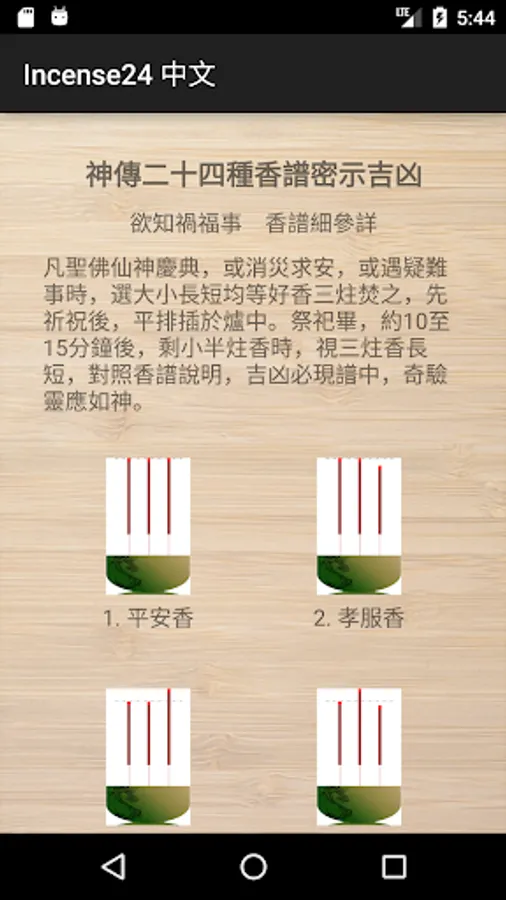 Based from ancient Chinese belief, the combination of 3 incense lengths after burning for 10-15 minutes or when the lengths are already less than half (for shorter incense) may indicate good or bad fortune. There are 24 incense combination presented in this application.