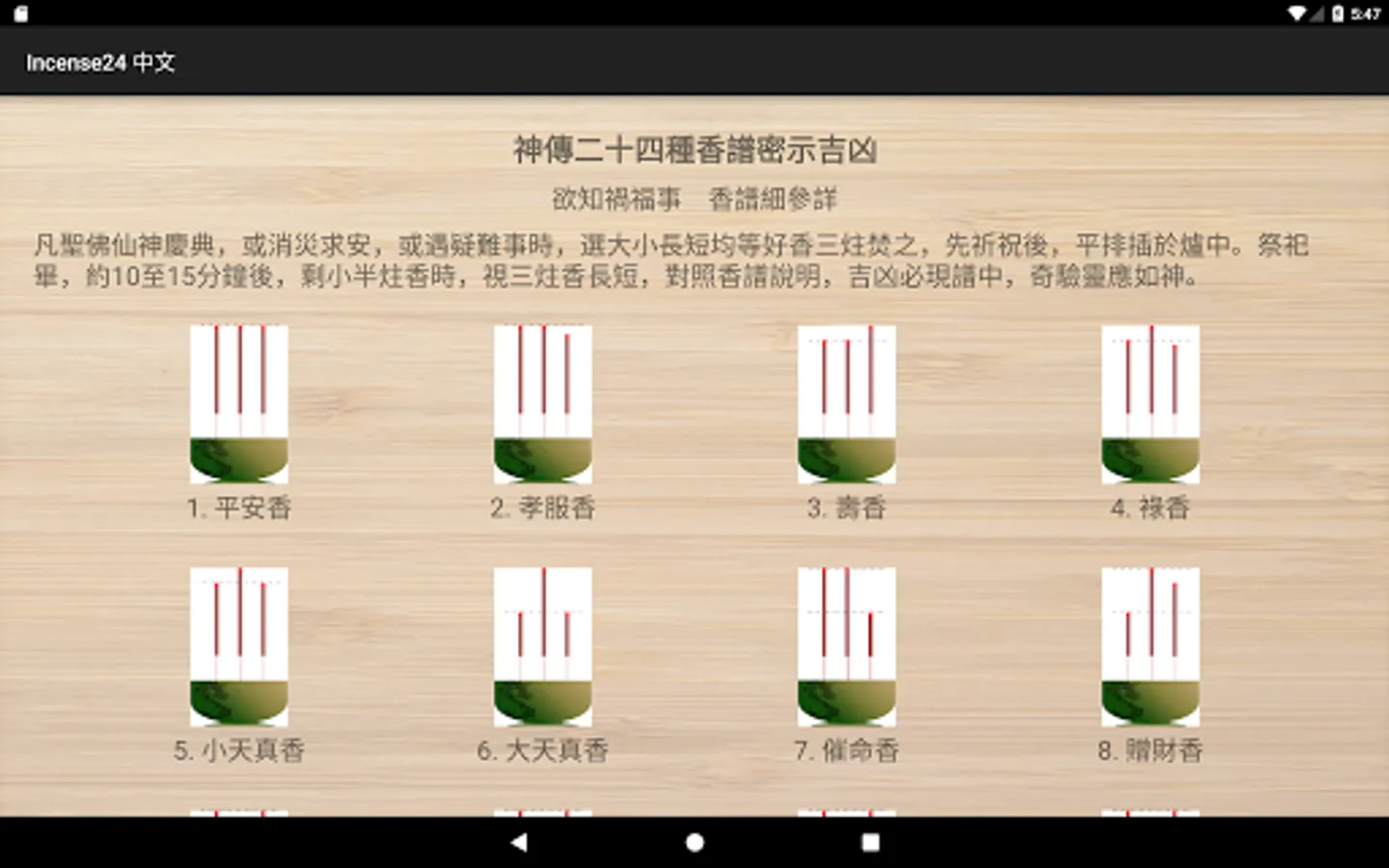 The buyer of this app automatically agrees that the contents and derived meaning of the presented incense are for reference only.