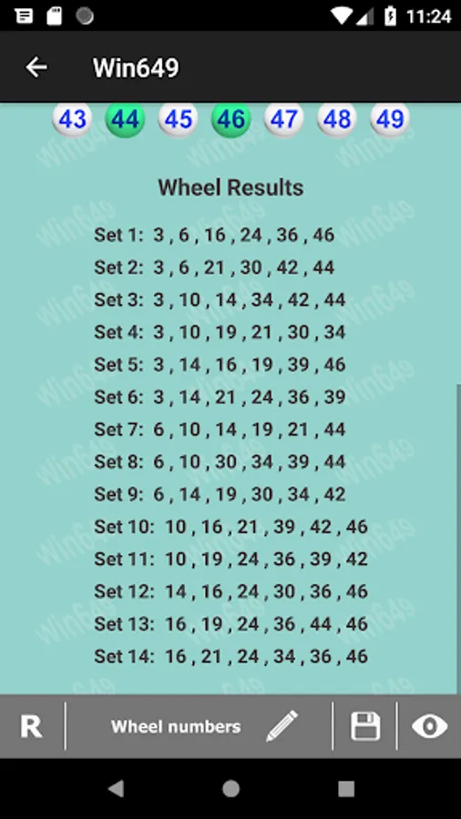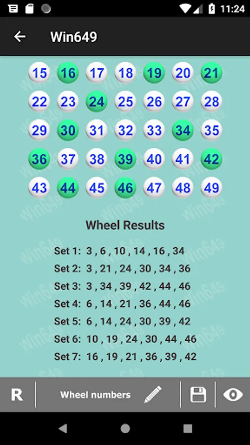 6. Six abbreviated wheels are available in this app. An abbreviated wheel is an economical alternative for a full wheel. Although an abbreviated wheel does not include all possible combinations of the chosen numbers, it still guarantees at least one winning ticket if some of the numbers drawn are within the player's selection of numbers. Please read more about wheeling system from various sources to familiarize yourself how it works.