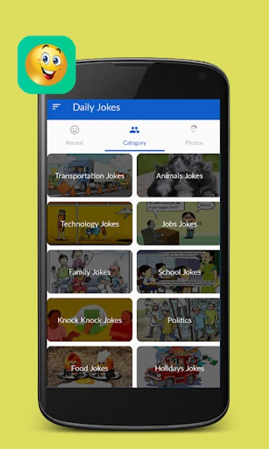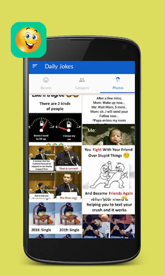 Latest , Trending and hot English joke app for you to laugh out loud . This app allow you to read jokes in different categories such as Animal Jokes , Technology Jokes, Jobs Joke and jokes from many more categories. It is like a Daily Joke book with all kinds of jokes. Each of the jokes on a separate page for you to read , so you have your own time to laugh , share and spread a word of laughter with your friends through SMS, Facebook, WhatsApp and other social media apps by just tapping on share button.