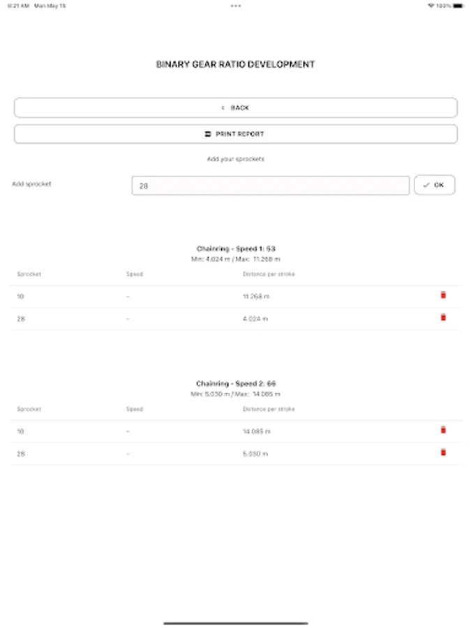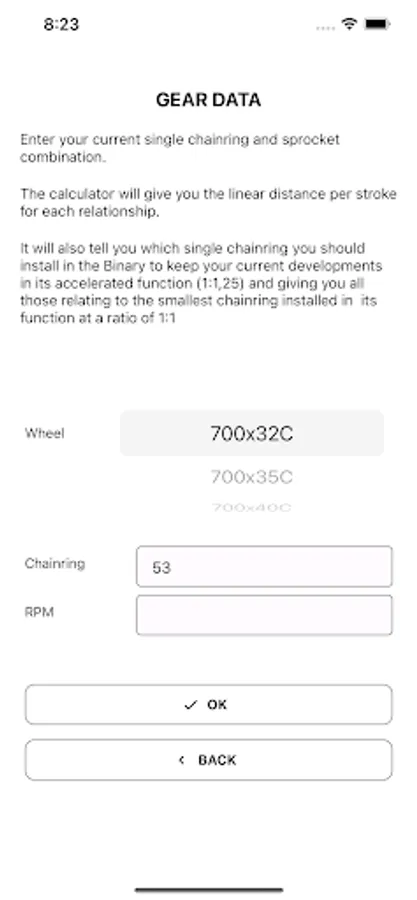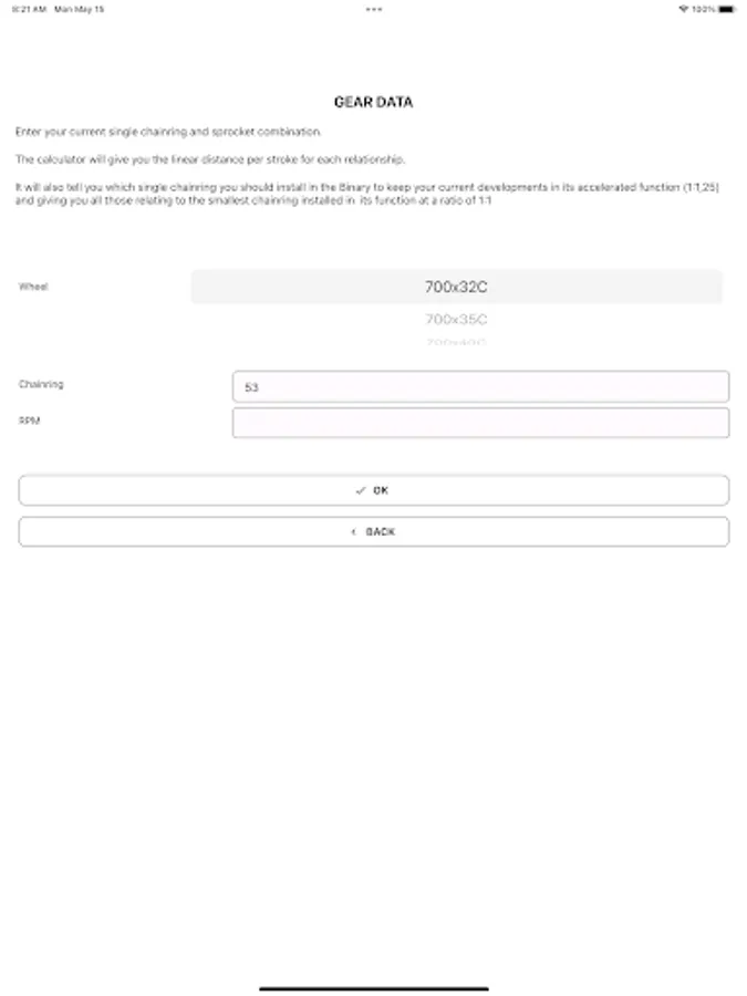 The app allows you to quickly and easily determine which types and sizes of optimal chainrings you should use on your bike fitted with the Binary Gear® system and the resulting metric ratio development, and compare it to the performance of a classic rear derailleur.