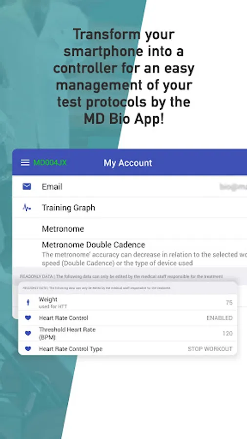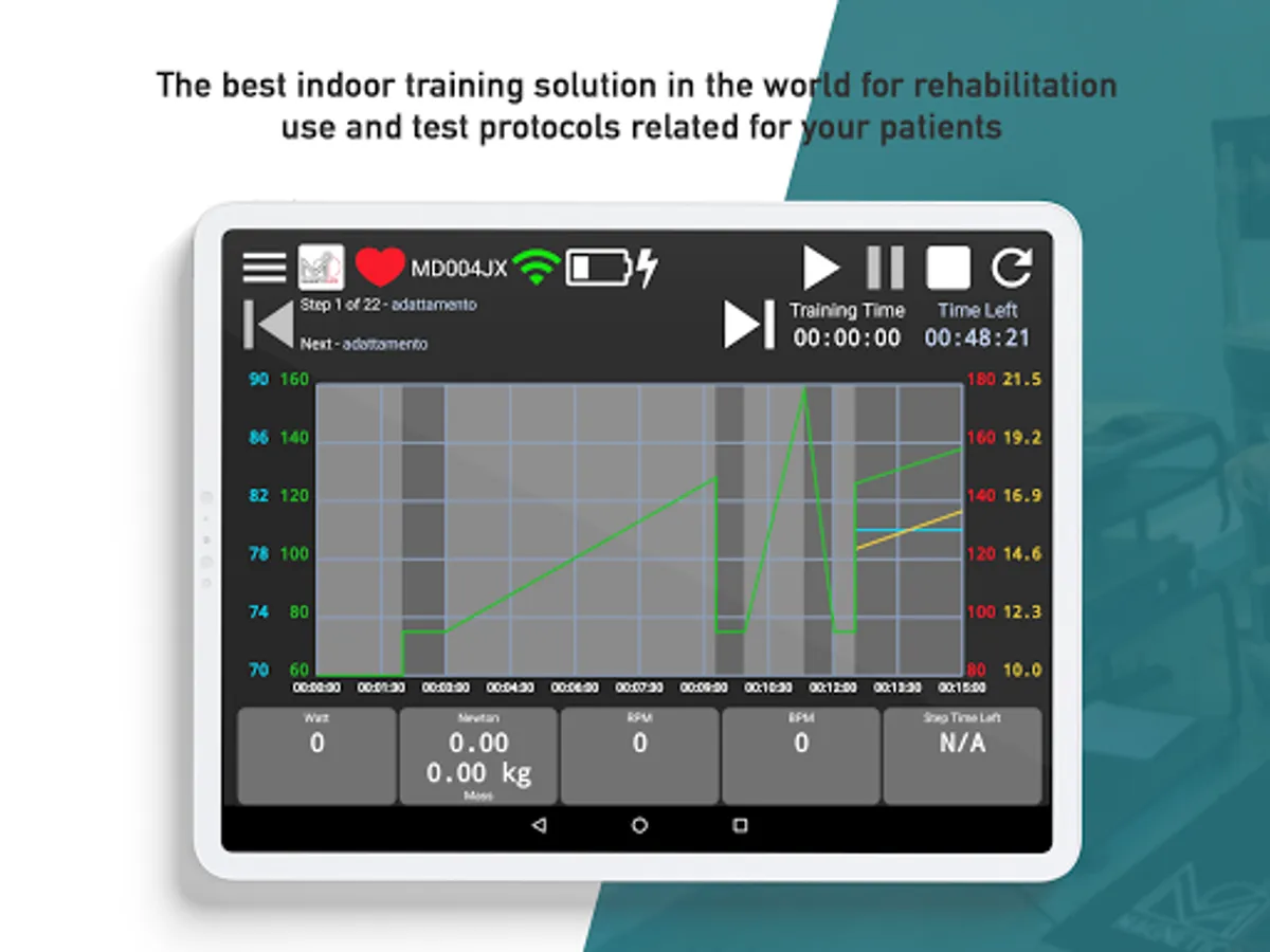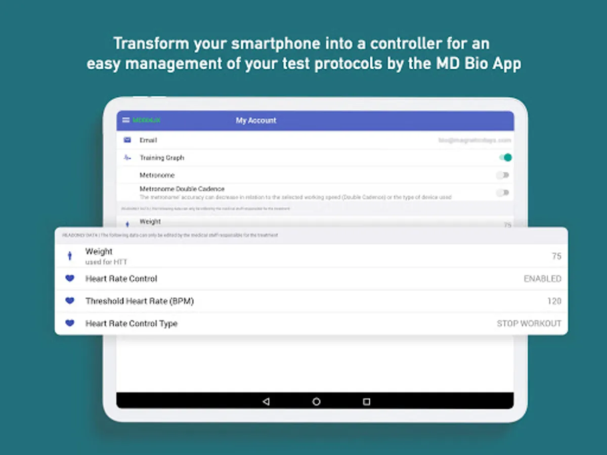 All the functions available in the MD App Bio are exclusive for rehabilitation use, as well as the workout protocols that are studied and loaded on the App by authorized medical personnel. The MD App Bio does not run with HTT workouts and/or similar, and does not support any other types of training.