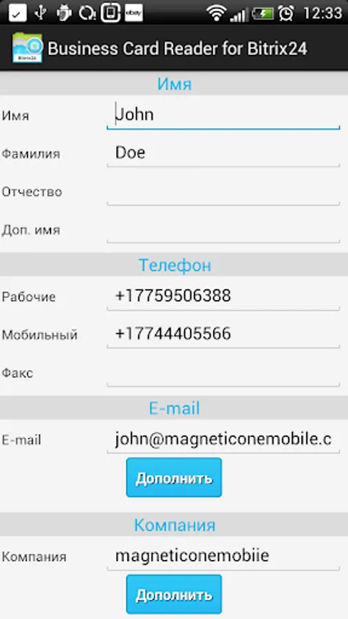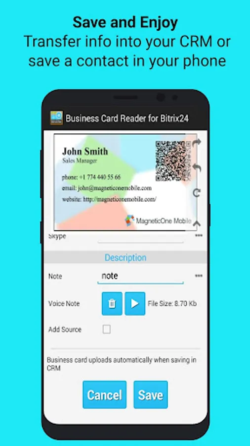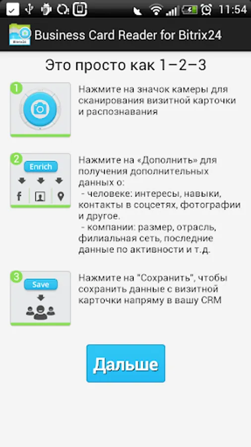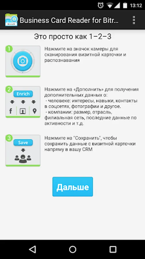 Business Card Reader for Bitrix24 CRM  is the easiest, fastest and secure solution for transferring information from paper business cards into the CRM systems using the camera of your smartphone. Take a picture of a business card and the application will scan and instantly export all card data directly to your CRM. In addition, this app will help you learn more about a potential client, partner or colleague. It is one of the best apps for CRM systems.