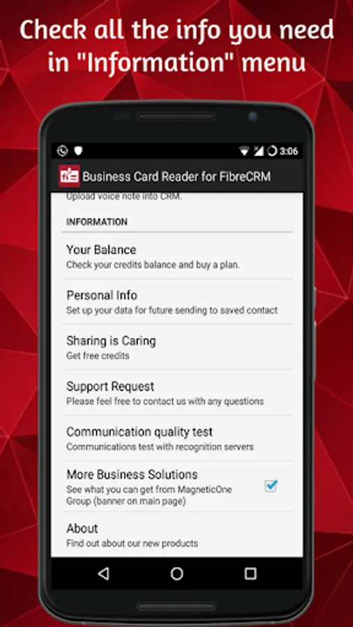 Business Card Reader for Fibre CRM  is the easiest, fastest and secure solution for transferring information from paper business cards into the CRM systems using the camera of your smartphone. Take a picture of a business card and the application will scan and instantly export all card data directly to your CRM. In addition, this app will help you learn more about a potential client, partner or colleague. It is one of the best apps for CRM systems.
