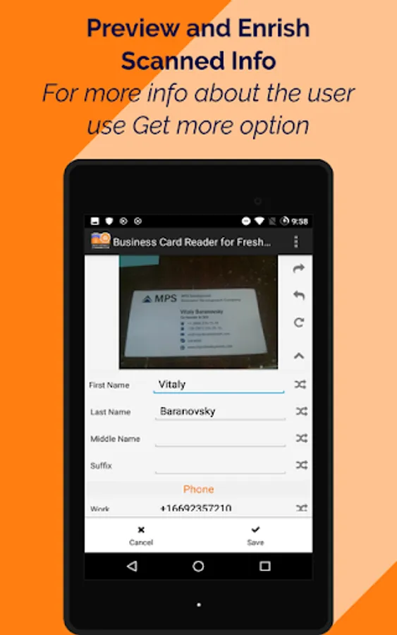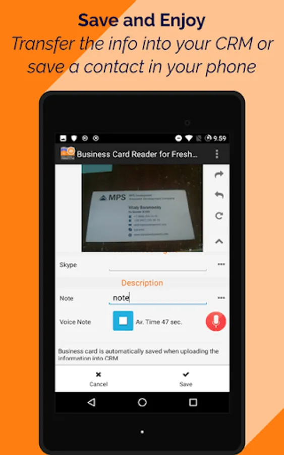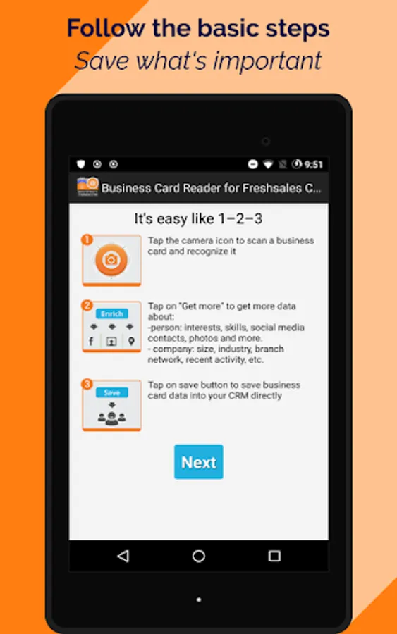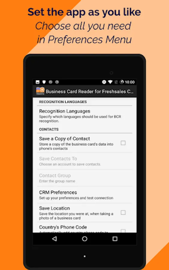 Business Card Reader for Freshsales CRM  is the easiest, fastest and secure solution for transferring information from paper business cards into the CRM systems using the camera of your smartphone. Take a picture of a business card and the application will scan and instantly export all card data directly to your CRM. In addition, this app will help you learn more about a potential client, partner or colleague. It is one of the best apps for CRM systems.