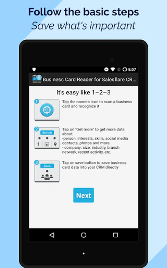 Business Card Reader for Salesflare CRM  is the easiest, fastest and secure solution for transferring information from paper business cards into the CRM systems using the camera of your smartphone. Take a picture of a business card and the application will scan and instantly export all card data directly to your CRM. In addition, this app will help you learn more about a potential client, partner or colleague. It is one of the best apps for CRM systems.