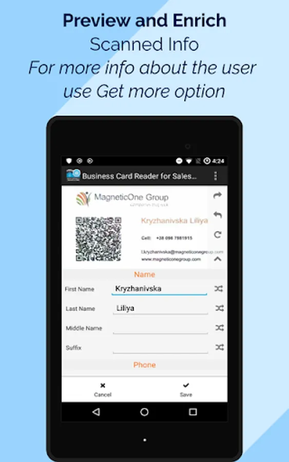 1. Take a photo of a business card, the app will automatically recognize all the information from it.