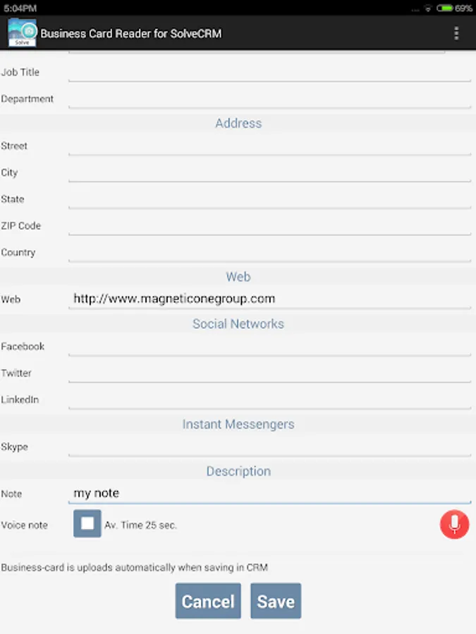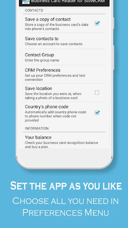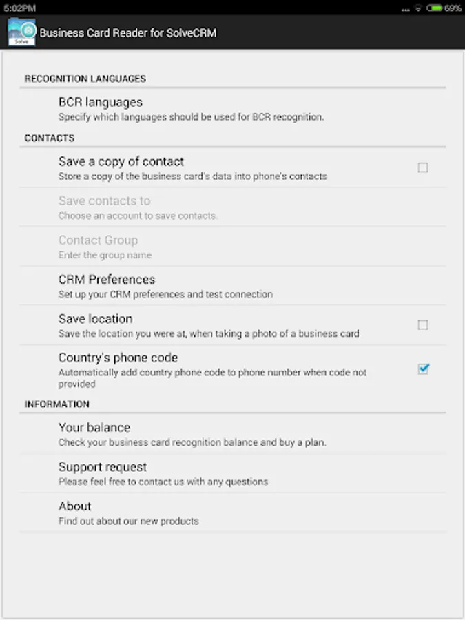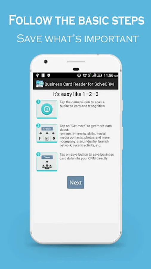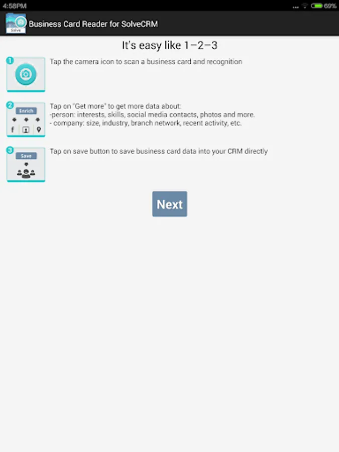 Business Card Reader for Solve CRM  is the easiest, fastest and secure solution for transferring information from paper business cards into the CRM systems using the camera of your smartphone. Take a picture of a business card and the application will scan and instantly export all card data directly to your CRM. In addition, this app will help you learn more about a potential client, partner or colleague. It is one of the best apps for CRM systems.