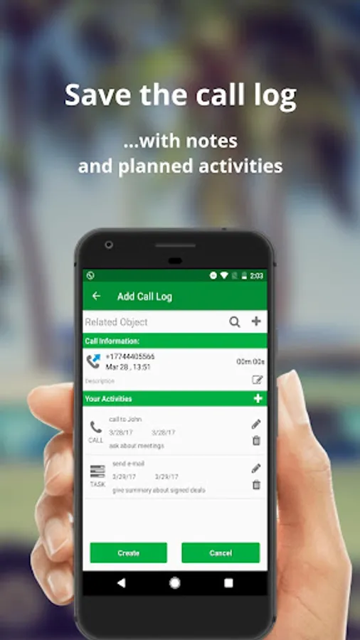 - The app provides you an opportunity to create planned activities into your CRM and set a reminder for them;
