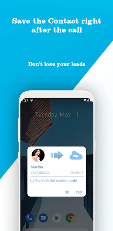 4. After the end of the call, you can choose to save it into your CRM, and the app will automatically send call info into the CRM (who called, date, call duration).